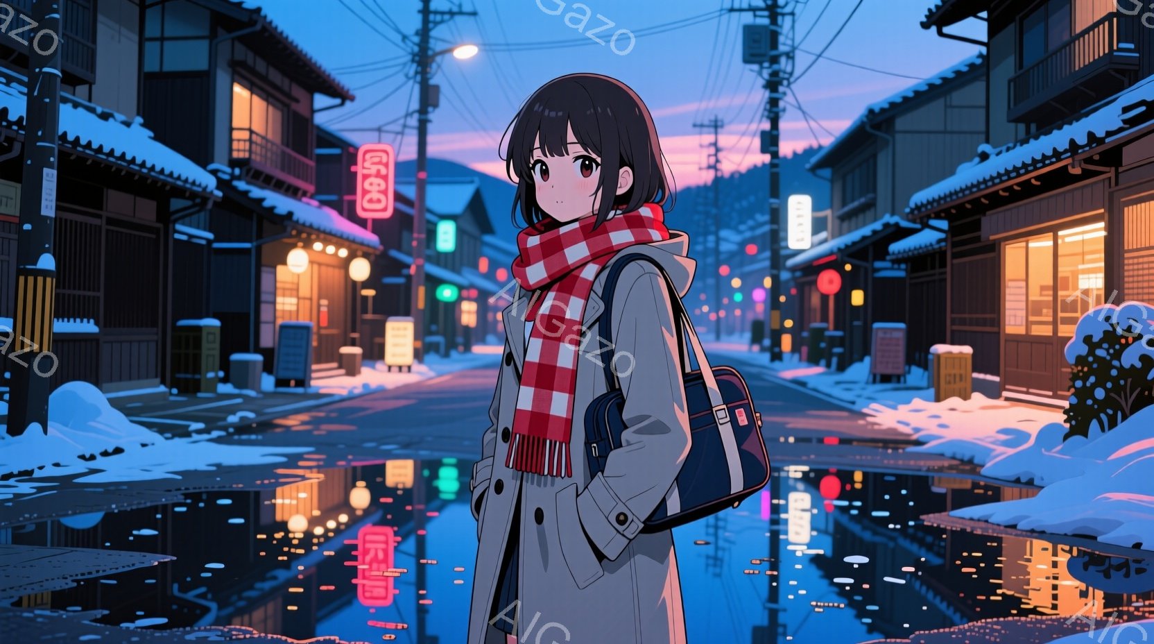 短い茶色の髪の少女は、白いコートとスカート、赤いストライプのスカーフを身につけて立っています。彼女は肩に黒いバッグを掛け、少し照れたような表情を浮かべています。背景には雪に覆われた古い街並みが広がり、濡れた路面に街灯やネオンサインが反射し、冬の静かで幻想的な雰囲気を醸し出しています。