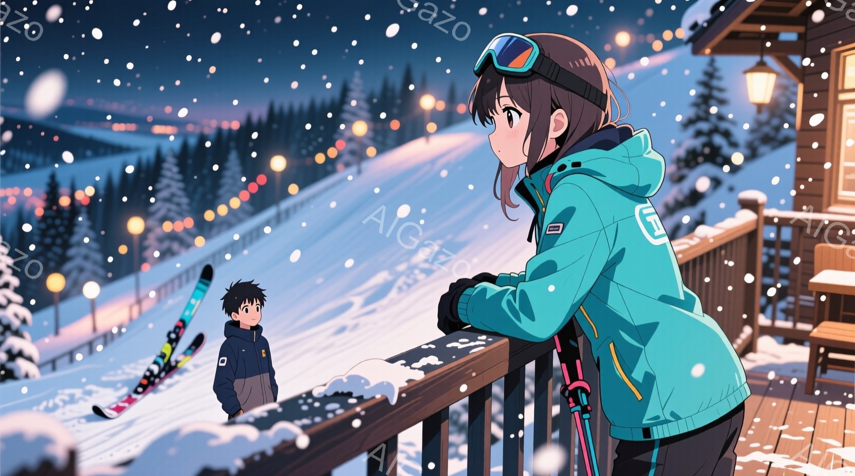 雪景色の中で寄り添う男女を描いています。男性は黒髪で、濃い青色のジャケットとベージュ色の首元をしています。女性は茶色の巻き髪で、ピンクと白のチェック柄のマフラーを巻き、頭にはスキーゴーグルをつけて、少し照れた表情をしています。