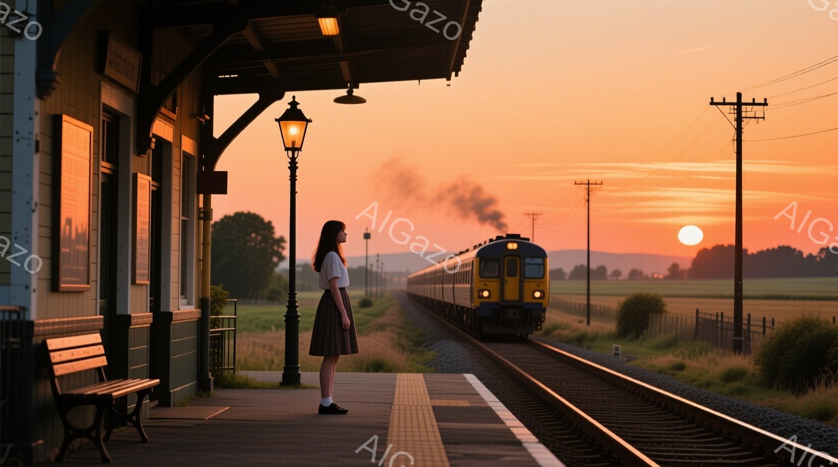夕焼けの背景に、プラットフォームに立つ少女が描かれている。彼女は白いブラウスに茶色のスカート、黒い靴を履いており、後ろで三つ編みの髪をしている。遠くには列車が近づいており、夕焼け空と草原が広がり、どこか懐かしい静寂な雰囲気を醸し出している。
