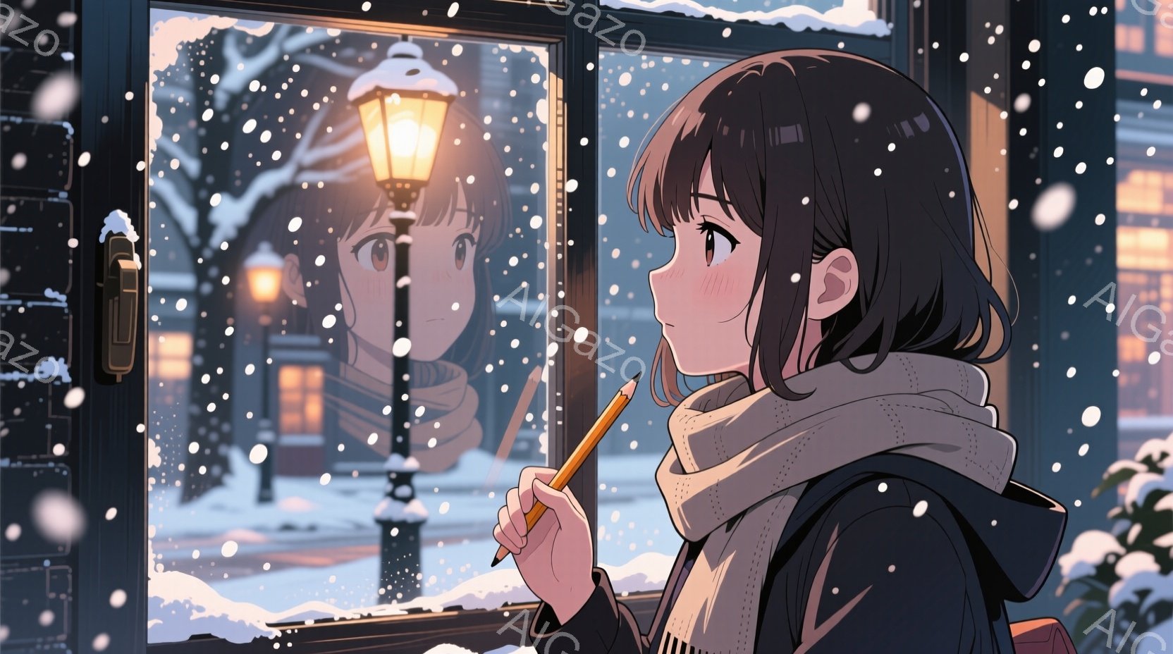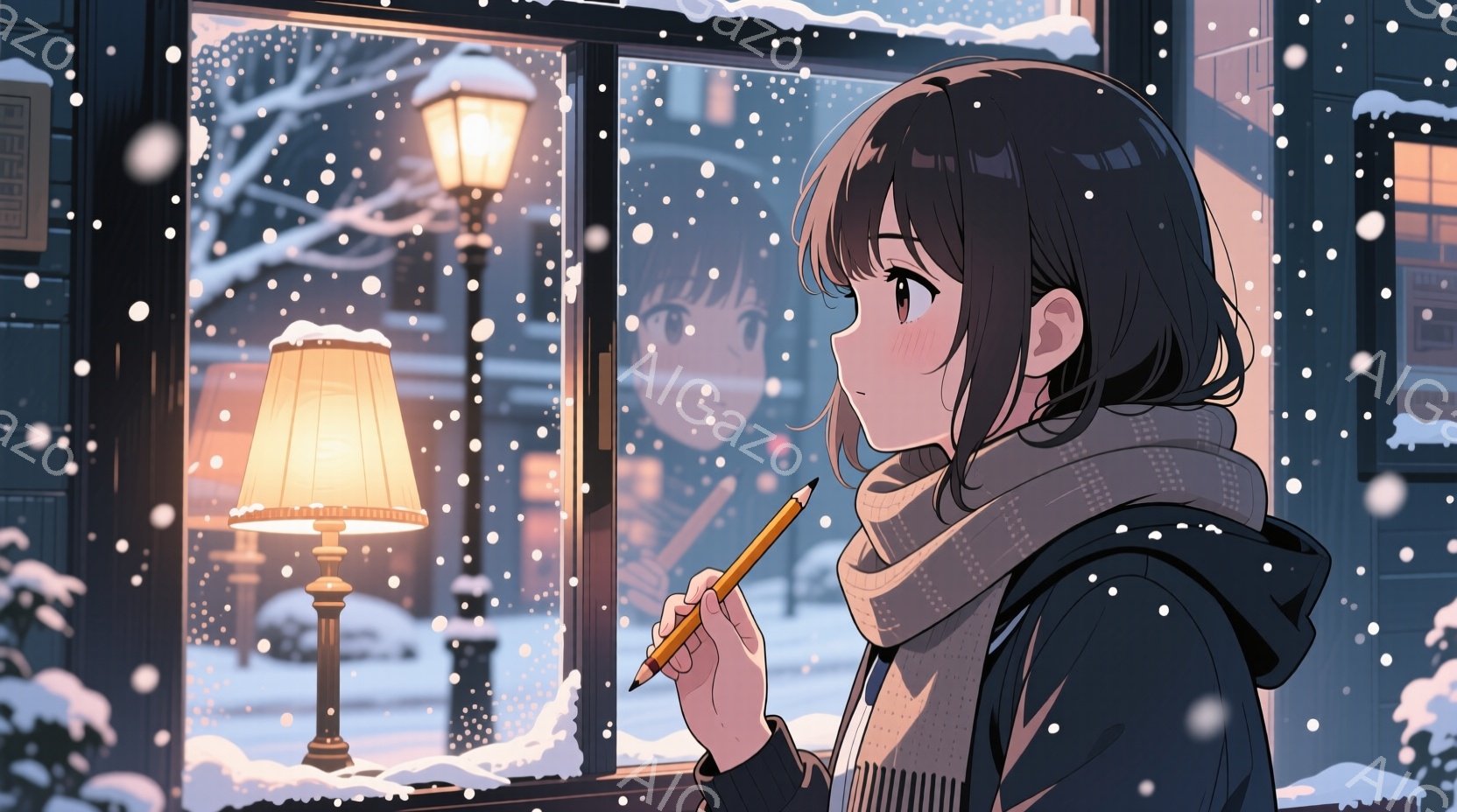 雪が降る夜、窓の外を眺める少女が描かれています。彼女は短い茶色の髪で、赤いストールと黒いジャケットを着て、何かを考えながら鉛筆を手にしています。背景には、雪に覆われた街並みと、暖かい光を放つ街灯が見え、全体的に物憂げで落ち着いた雰囲気が漂っています。