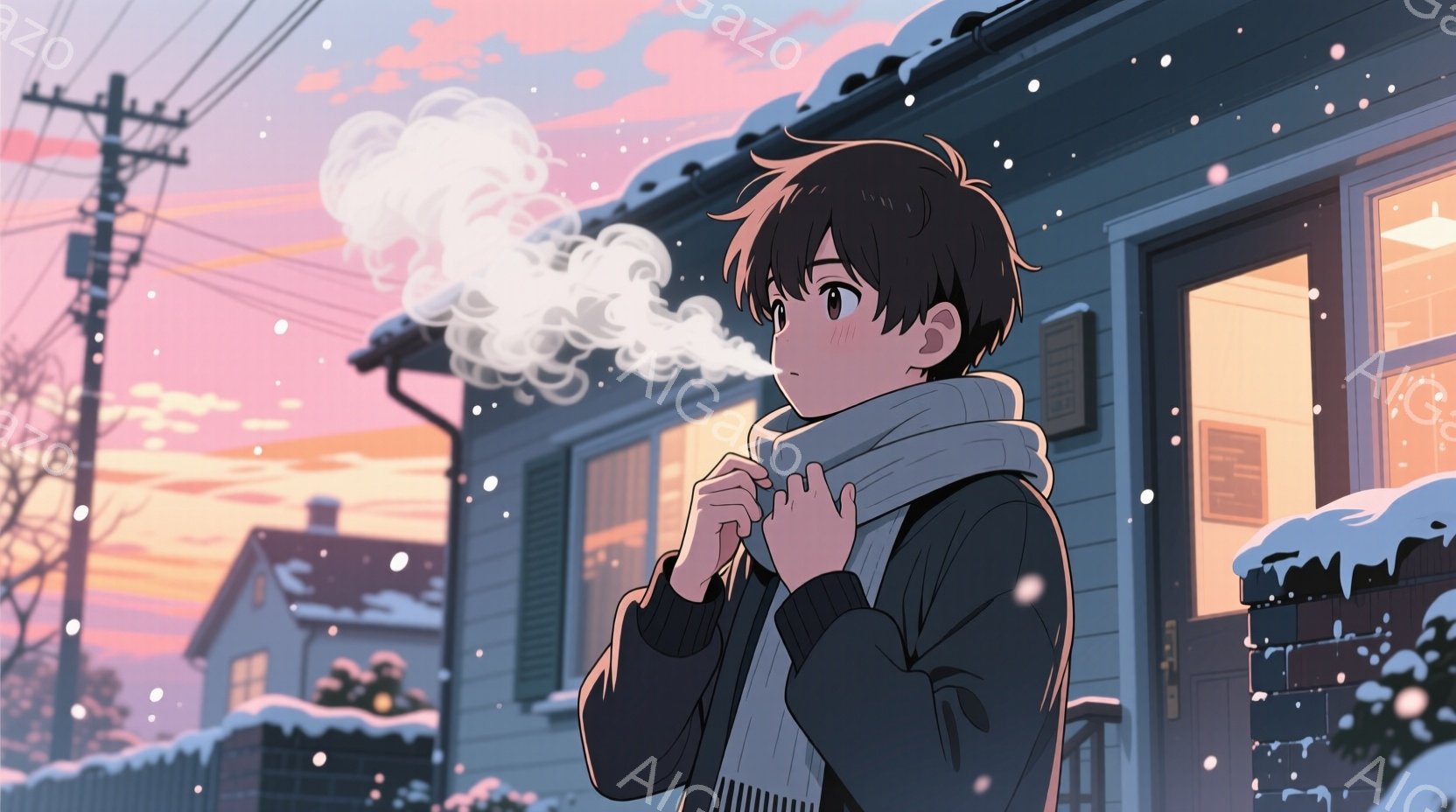 短い黒髪の少年が、寒さで息を吐き出しており、首に巻き付けた暖かい縞模様のマフラーが印象的です。彼は黒いジャケットを着ており、雪が積もった住宅街の前に立っています。背景には、夕焼けに染まる空と、暖かく光る家々があり、冬の静かで穏やかな雰囲気を醸し出しています。