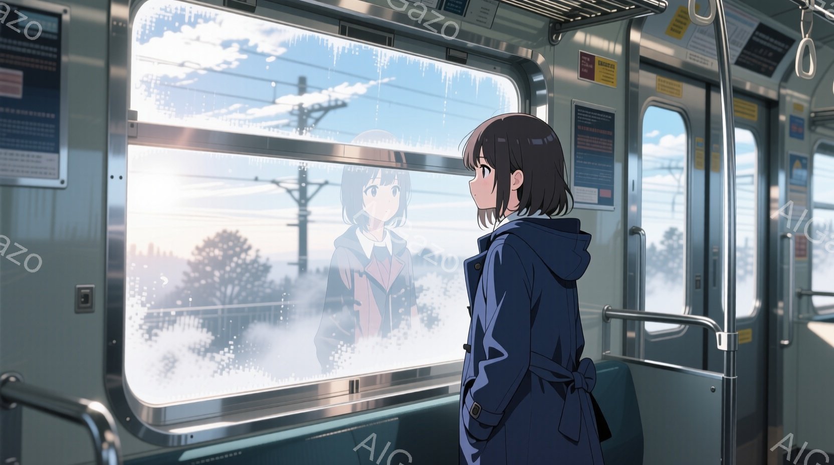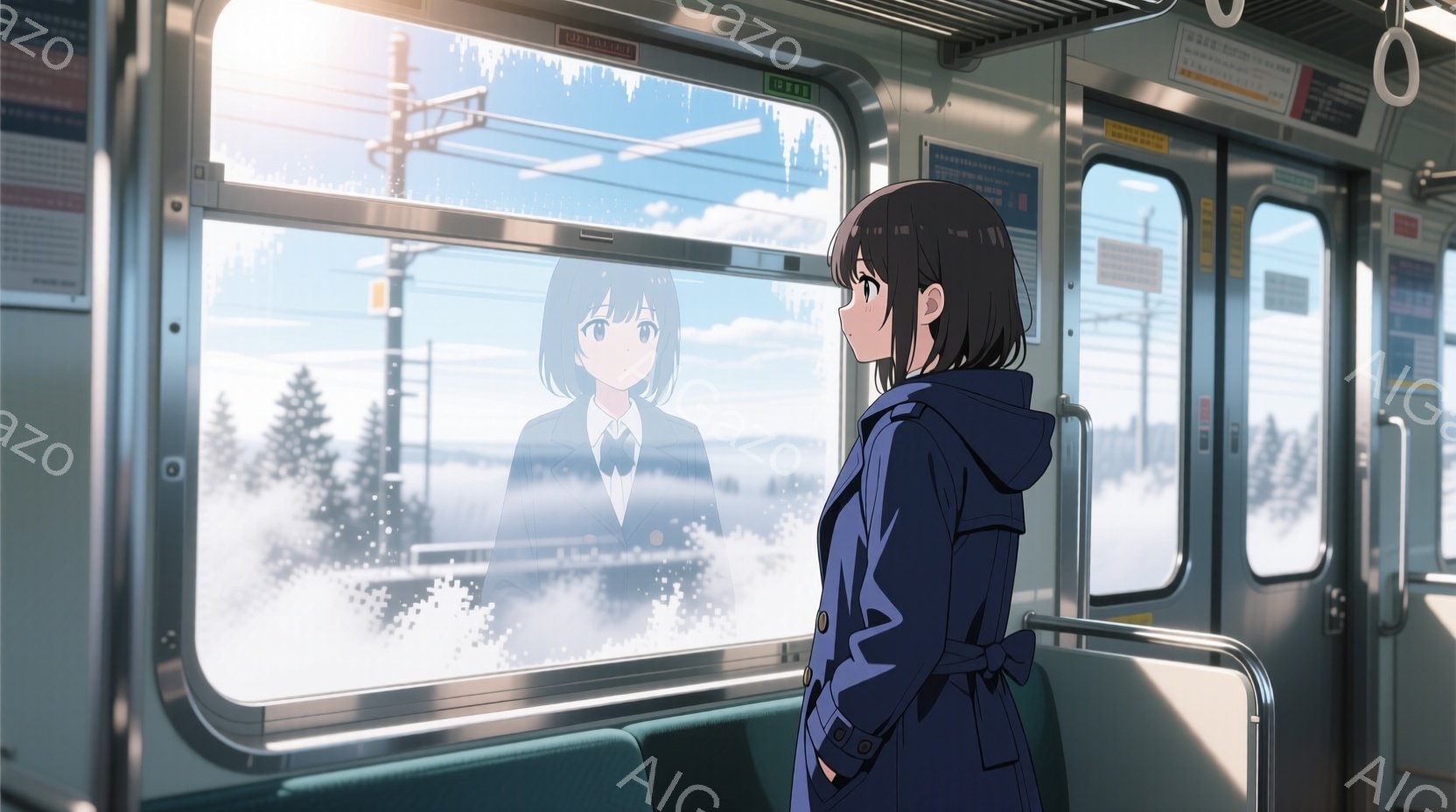 ショートカットの黒髪の女性が、紺色のパーカー付きジャケットを着て、電車の窓の外を見つめている。窓には彼女のぼんやりとした反射が見え、背景には雪景色が広がり、遠くには電柱と薄い木々が見える。電車内は薄暗く、どこか物憂げな雰囲気が漂っている。
