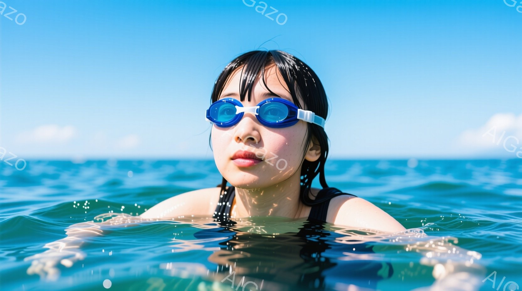 水色のゴーグルをつけた女性が、水中に上半身を浸けている。黒髪は濡れて額に張り付き、わずかに微笑んだ表情で、リラックスした様子が伺える。背景には穏やかな青い海が広がり、晴天の下、水面にはキラキラと光が反射している。