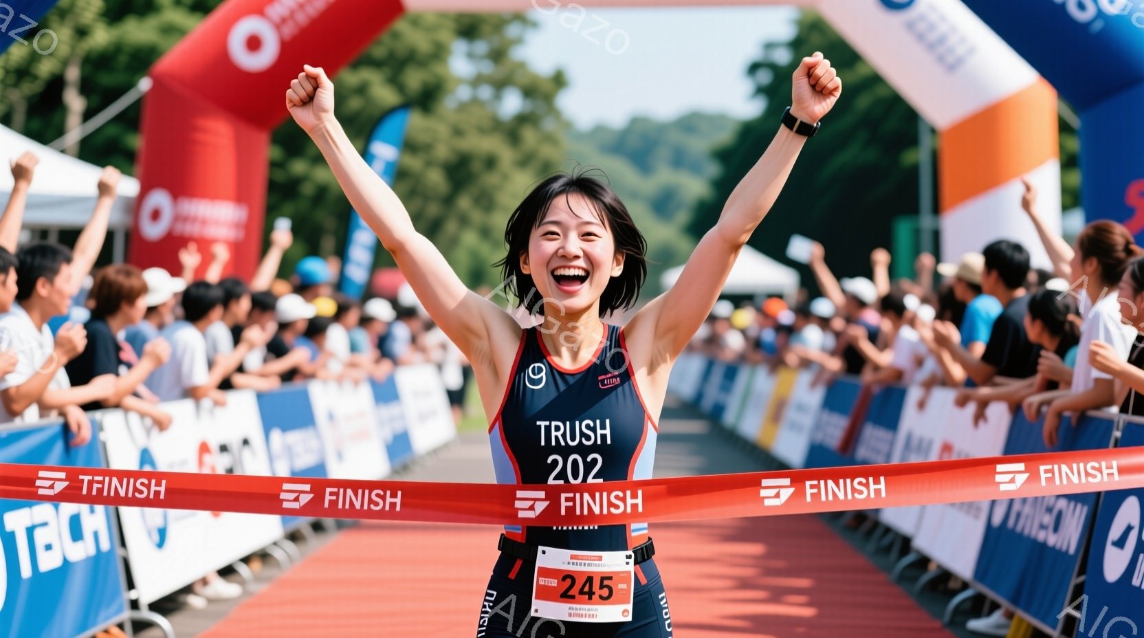 この女性は、マラソンやトライアスロンなどの競技のフィニッシュラインを走り抜けている様子が写っています。彼女は黒と青のレーシングスーツを着て、頭には白い帽子を被り、顔には勝利の笑顔が浮かんでいます。背景には、多くの観客や競技関係者、そしてフィニッシュラインを示す赤いテープやコーンが見え、晴天の下、活気ある雰囲気が伝わってきます。