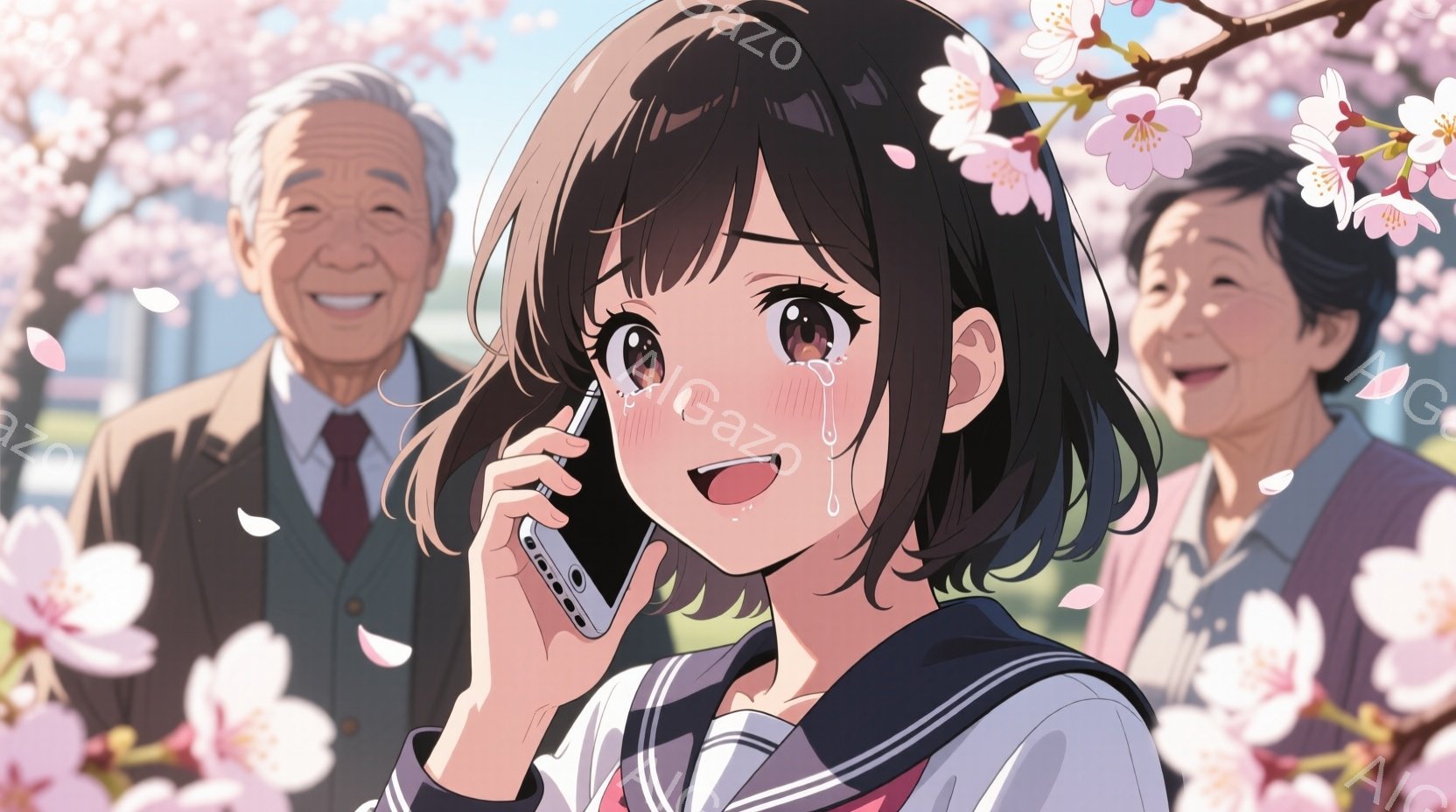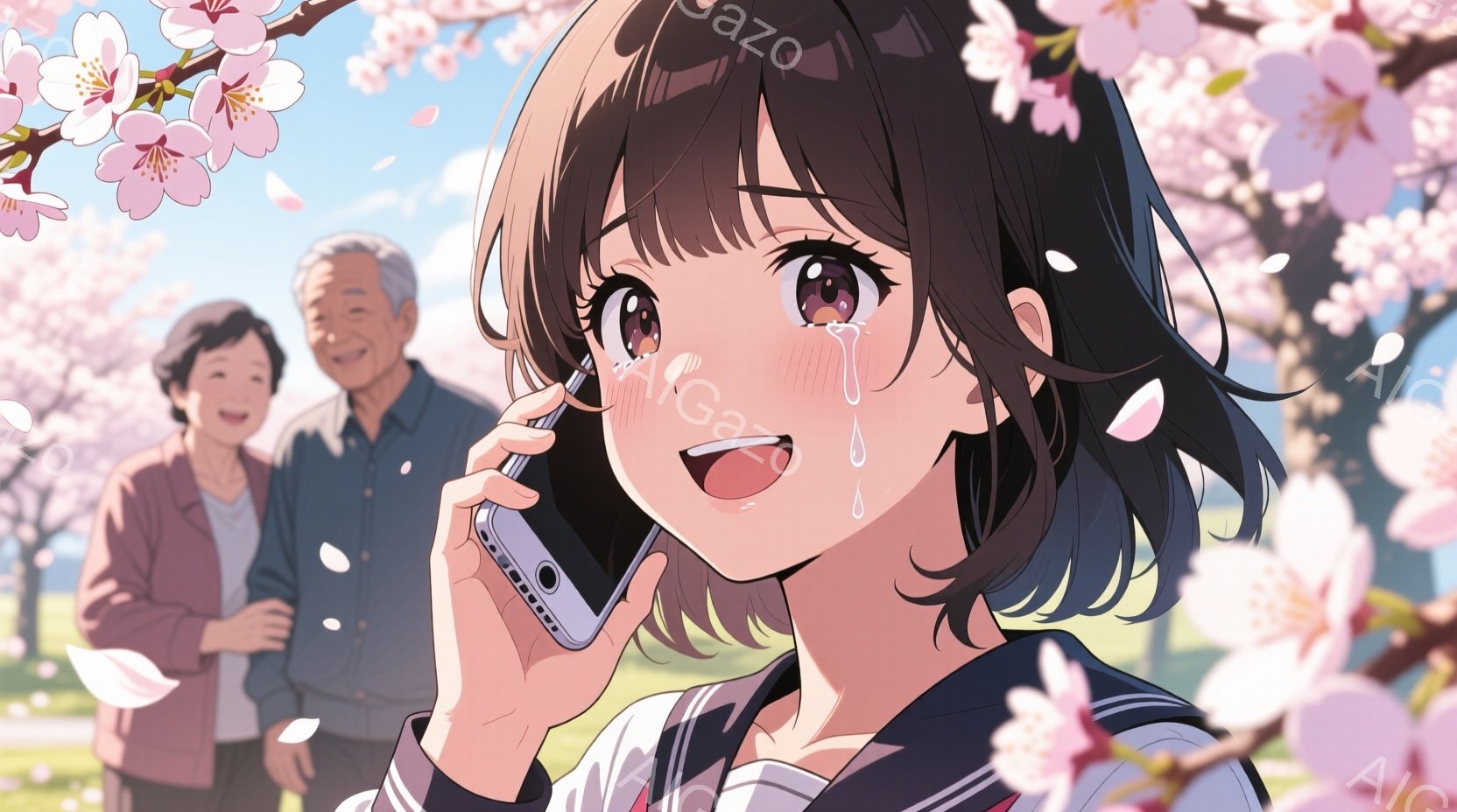 桜の花びらが舞う春の日に、スマートフォンで電話をしている若い女性を描いています。彼女は制服を着ており、短い茶色の髪で、喜びと感動で涙を流した表情をしています。背景には桜の木々と、ぼやけた笑顔の男性がおり、全体的に暖かく、感動的な雰囲気が漂っています。