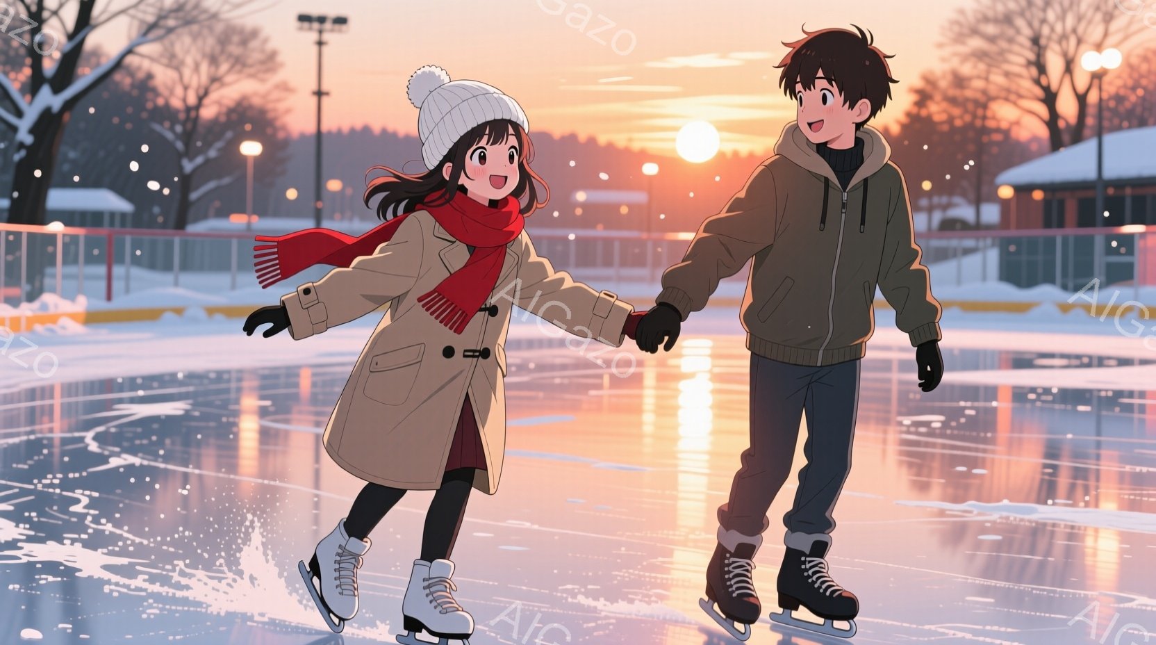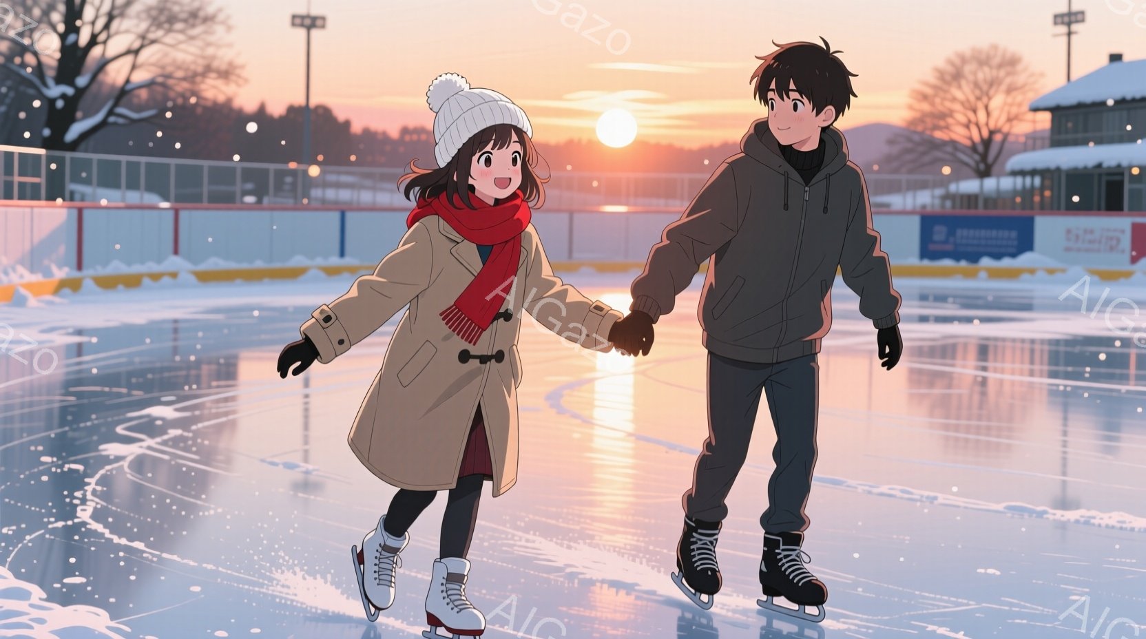屋外スケートリンクで、若い男女が手をつないでスケートを楽しんでいます。女性は赤いニット帽とキャメル色のコート、黒いレギンス、黒い手袋を着ており、笑顔で少し前かがみの姿勢です。男性は黒いジャケットと黒いズボン、手袋を着用し、女性の手をしっかりと握りながら、同じように笑顔で少し前かがみになっています。