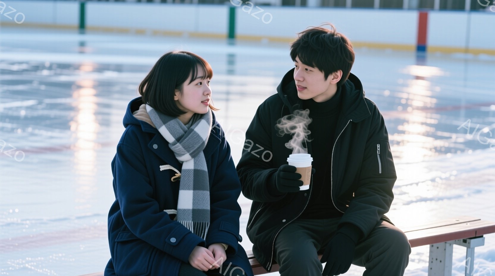 スケートリンクのベンチに座っている若い男女が写っています。女性は紺色のパーカーに白い縞模様のスカーフを巻き、黒髪を肩下まで伸ばしています。男性は黒いジャケットとズボンを着用し、暖かい飲み物を手にしています。
