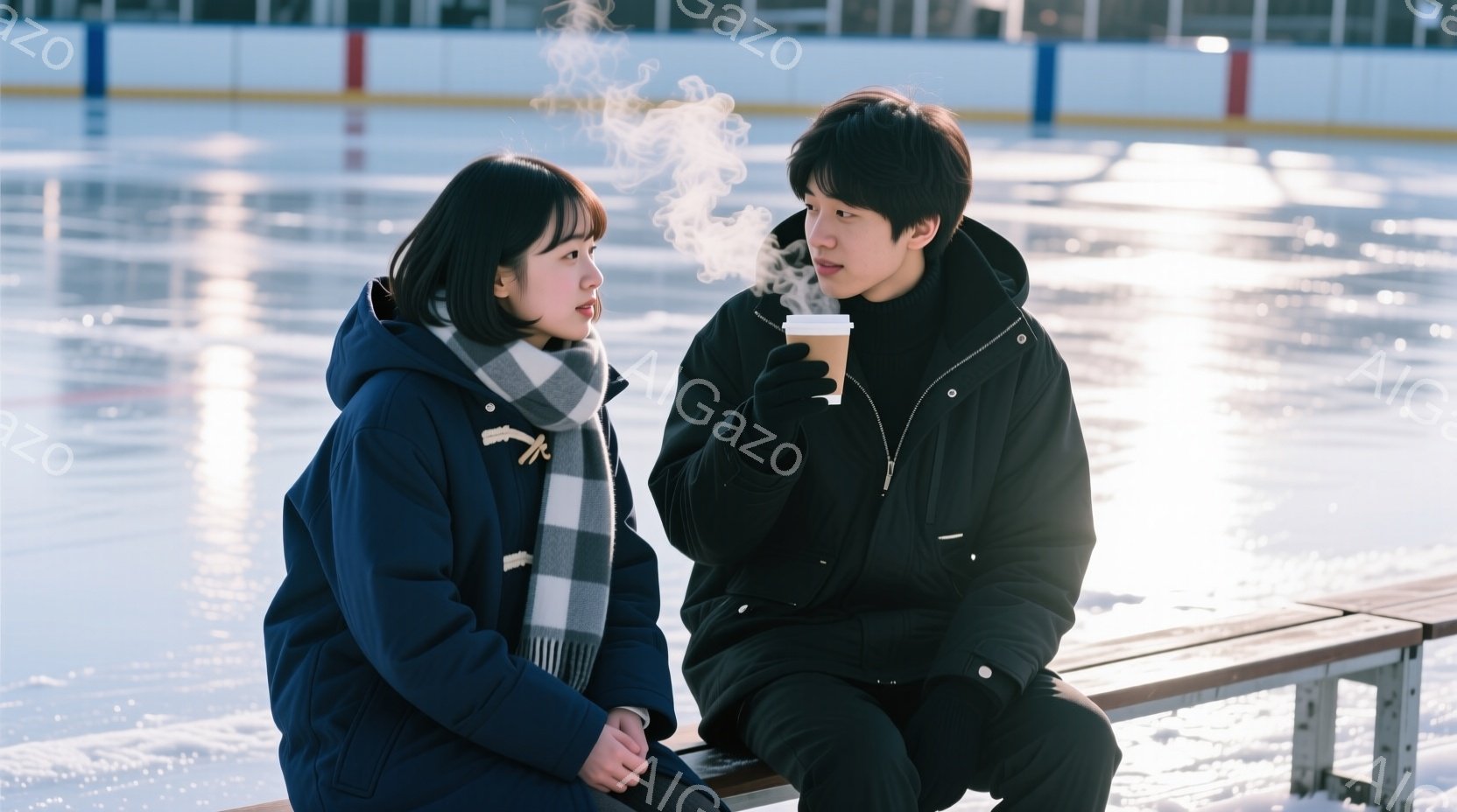 紺色のパディングジャケットにチェック柄のマフラーを巻いた女性と、黒いジャケットを着た男性がベンチに座り、互いに顔を見合わせて微笑んでいます。男性は紙コップに入った温かい飲み物を手に持ち、湯気が立ち上っています。背景はスケートリンクで、氷面が光り輝き、晴れた冬の日の穏やかな雰囲気を醸し出しています。