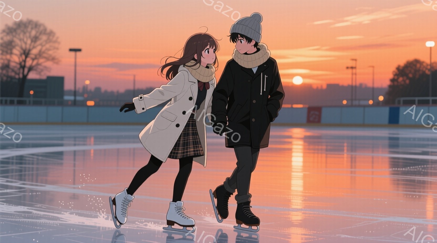 少女は白いコートとチェック柄のスカートを着て、金髪を肩まで伸ばし、笑顔でスケートを楽しんでいる。少年は黒いニット帽とジャケットを着て、少しうつむき加減でスケートをしている。背景は夕焼け空の下のスケートリンクで、遠くに建物や木々が見え、全体的に暖かくロマンチックな雰囲気である。