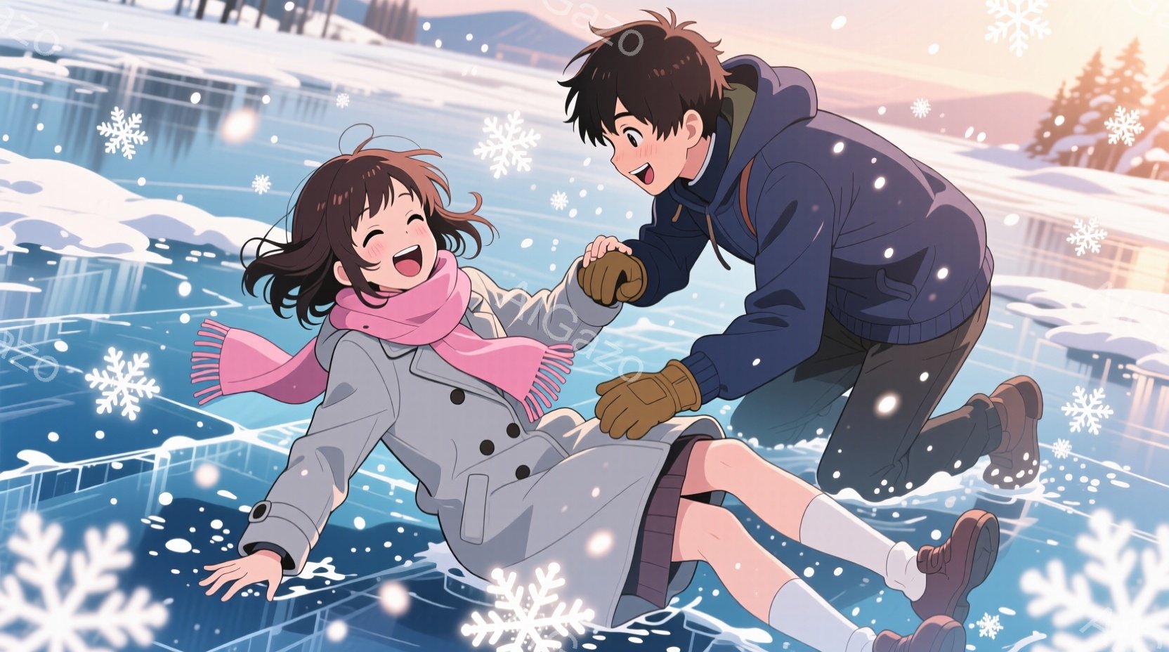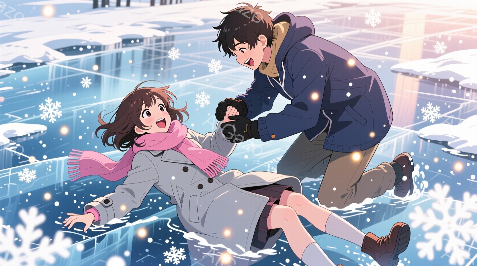 雪が降る中、若い女性が滑って倒れ、男性が彼女の手を掴んで支えようとしている場面です。女性はピンクのストールを首に巻き、白いコートを着ており、男性は紺色のジャケットと黒いズボンを着用しています。背景には雪景色が広がり、暖かい雰囲気と少しコミカルな状況が描かれています。
