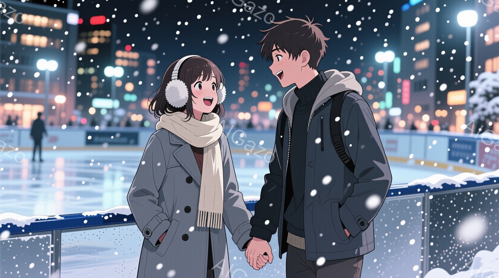 白いコートを着た女性と黒いコートを着た男性がアイススケートリンクで手をつないで滑っている。女性はピンクのスカーフを巻き、白いスケート靴を履いており、男性は黒いスケート靴を履いている。背景には、ライトアップされた木々と雪景色が広がり、ロマンチックで温かい雰囲気を作り出している。