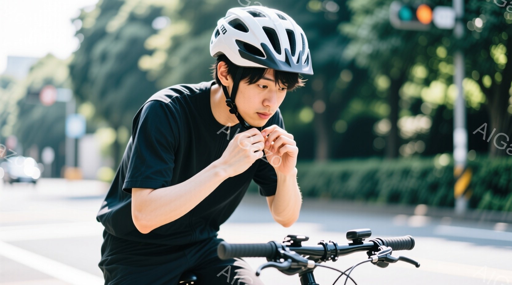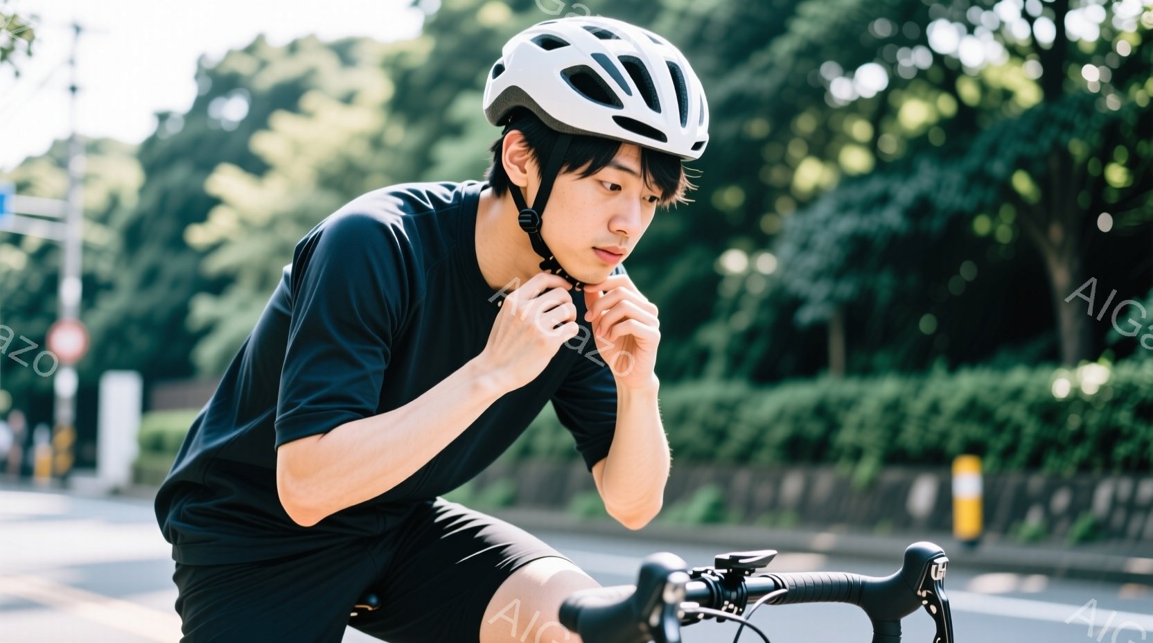 若い男性が自転車に乗り、ヘルメットのあご紐を締めている様子が写っている。彼は黒の半袖シャツと短パンを着用し、黒髪を短く整えている。背景には緑豊かな木々が見え、晴れた日の屋外で自転車に乗る準備をしている様子が伺える。