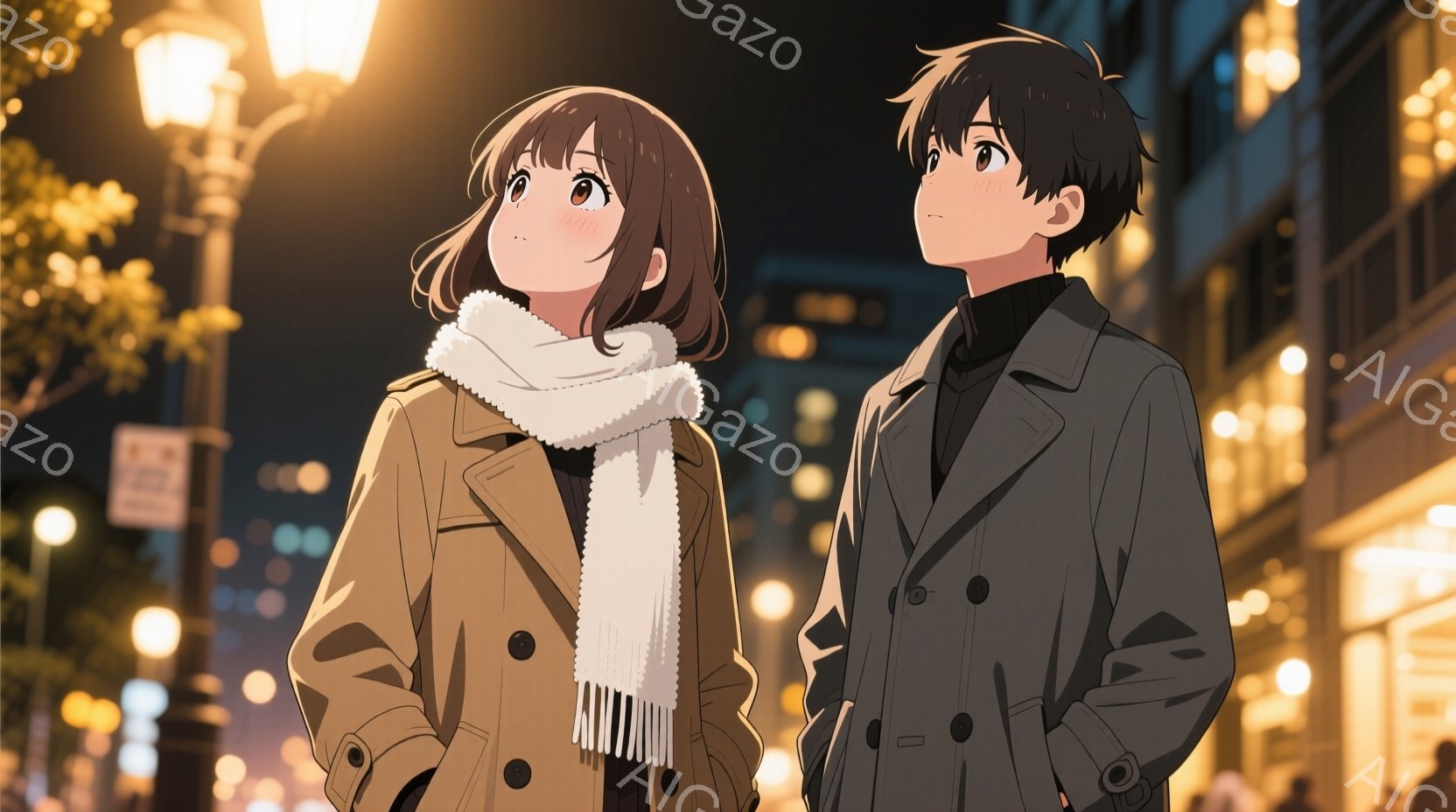 この無料AI生成画像「街の夜景を背景に、若い男女が並んで立っている様子が描かれています。女性は茶色の巻き毛にベージュのコートと白いマフラーを着用し、少し上を見ている表情はどこか希望に満ちています。男性は黒いニットにグレーのコートを着ており、同じように少し上を見上げ、わずかに微笑んでいるような表情を浮かべています。」は、2025年10月27日に作成されました。 サイズは 1664×928px の高解像度で、商用利用も可能なフリー素材として提供しています。