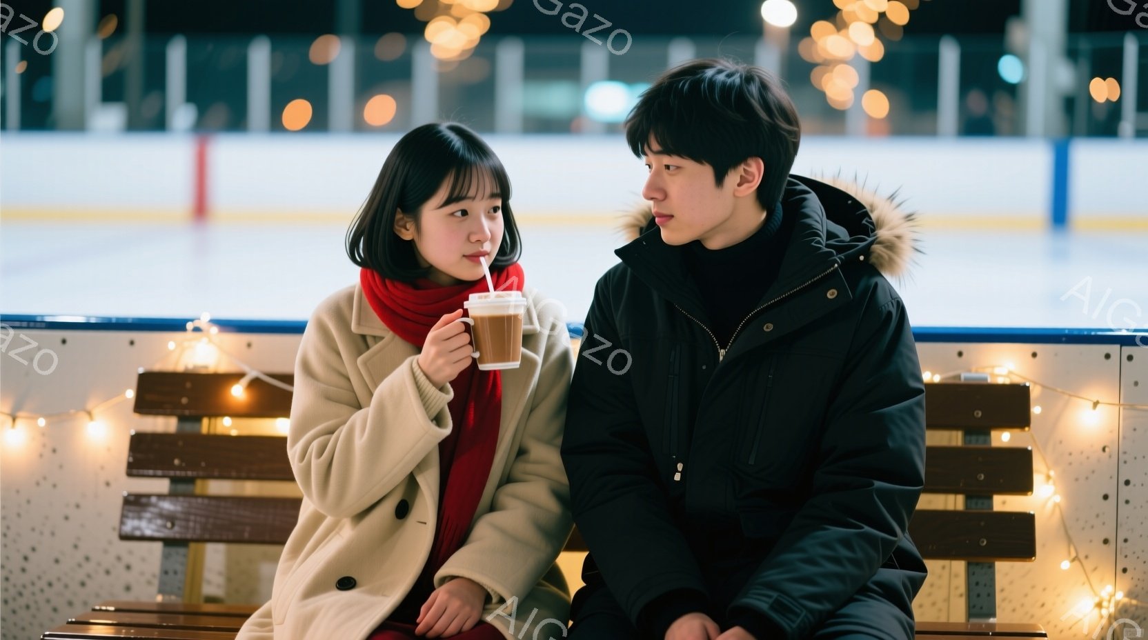 アイススケートリンクのベンチに座っている若い男女が写っています。女性はベージュのコートに赤いマフラーを巻き、温かい飲み物を手にしています。男性は黒いジャケットを着ており、二人は横並びで少し身を寄せ合い、穏やかな表情を浮かべています。