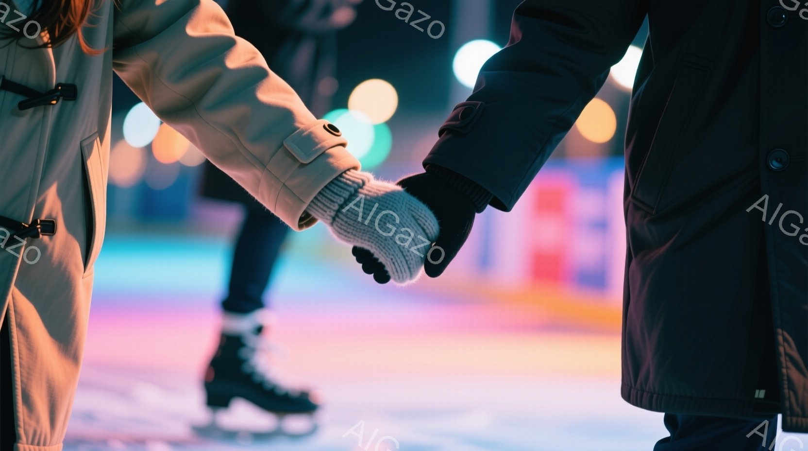 白いコートを着た女性と黒いコートを着た男性が手を繋いでいます。背景は夜の街並みで、ぼやけた光が幻想的な雰囲気を醸し出しています。二人の間には温かい感情が伝わってくる、ロマンチックな光景です。