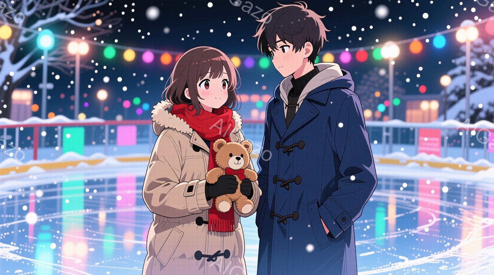 若い男女がアイススケートリンクの前に立っている様子が描かれています。女性は茶色の髪を肩まで垂らし、白いコートと赤いマフラーを着用し、テディベアを抱えています。男性は黒髪で、濃い青色のコートを着ており、二人は互いを見つめ合い、穏やかでロマンチックな雰囲気を醸し出しています。