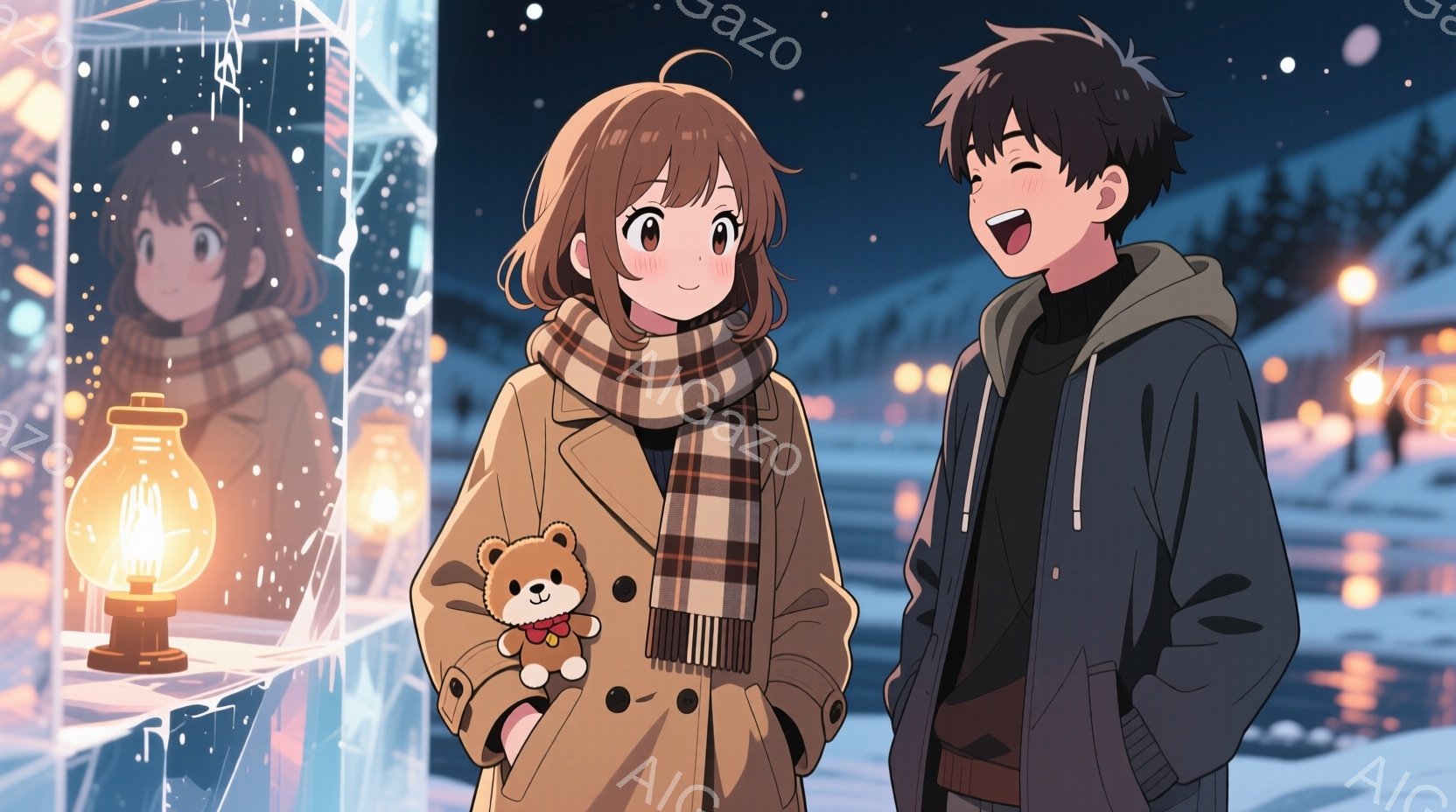 コートを着てスカーフを巻いた若い女性と、ジャケットを着た若い男性が描かれています。女性はテディベアを抱き、微笑んでいますが、男性は目を閉じ、楽しそうに笑っています。背景には雪が降る夜の街並みが広がり、建物や街灯がぼんやりと光る暖かく幻想的な雰囲気です。