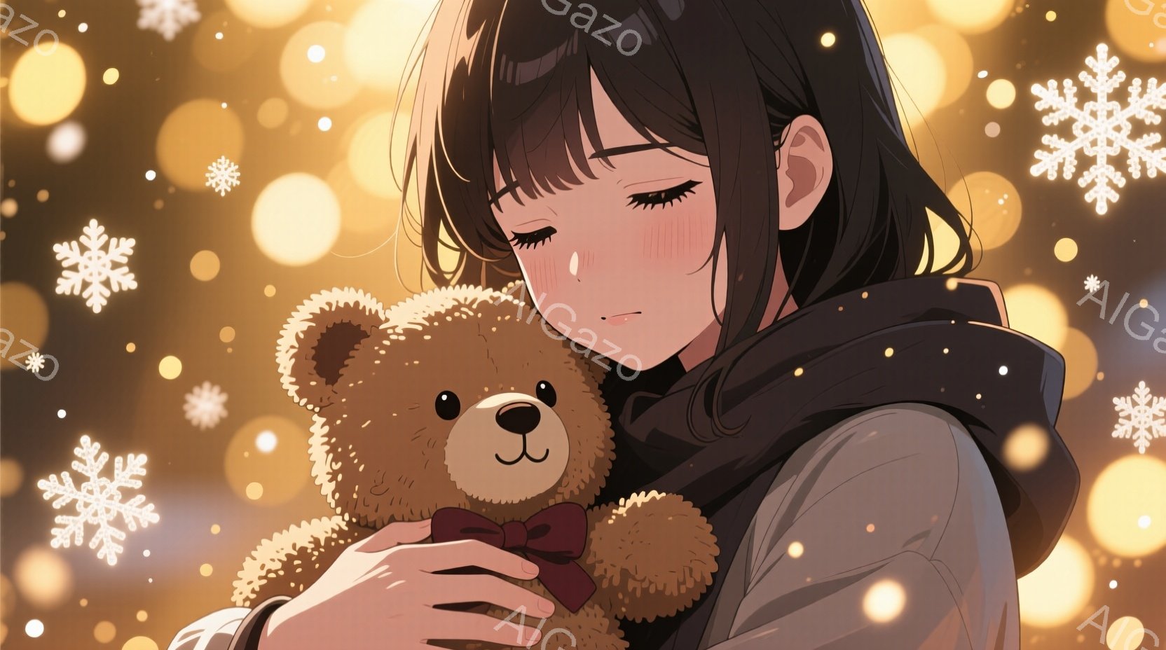 短い黒髪の少女が、茶色のテディベアを抱きしめています。グレーのパーカーを着ており、少し寂しげな表情を浮かべています。背景にはぼやけた光の粒子と雪片が舞っており、暖かく幻想的な雰囲気を醸し出しています。