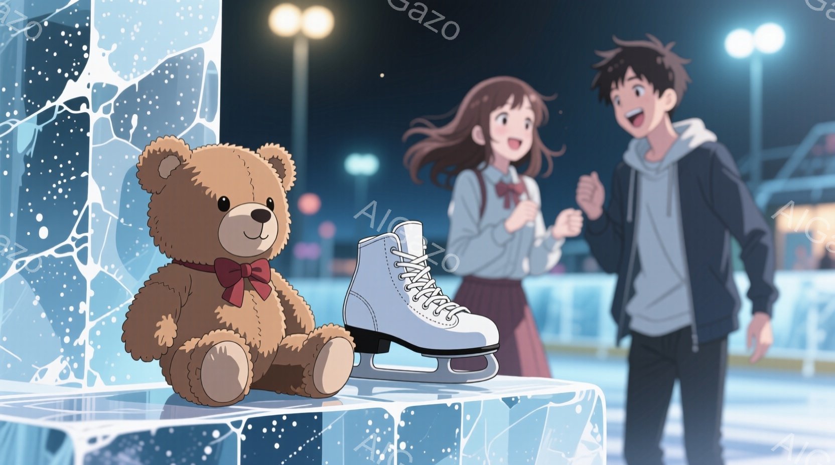 氷のスケートリンクの上に、茶色のテディベアが赤いリボンを付け、白いスケート靴を横に置いて座っています。リンクの端には、ピンクのセーターを着た茶髪の少女と、白いTシャツに緑色のジャケットを着た少年がいて、楽しそうに微笑み合っています。背景は夜のスケートリンクで、ぼやけた照明と観客席が見え、全体的に温かく、ほのぼのとした雰囲気です。