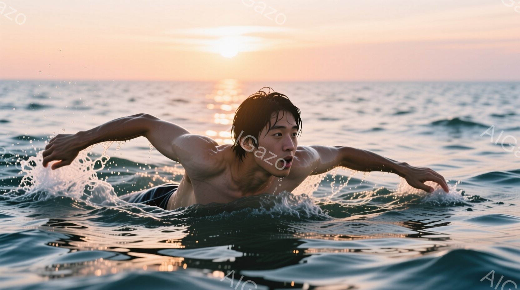 一人の男性が海でクロール泳ぎをしている。彼は上半身裸で、濡れた黒髪が額にかかっている。背景には夕焼けが広がり、海面はオレンジ色に輝いており、穏やかで美しい雰囲気を醸し出している。