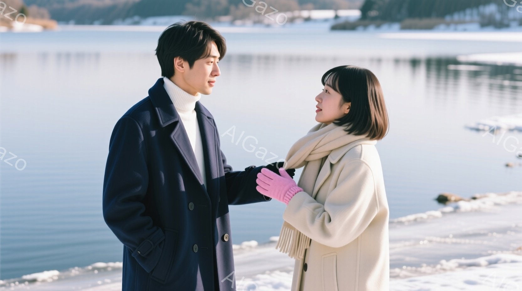 紺色のコートを着た男性と、白いコートを着た女性が並んで立っています。男性は女性の肩に手を置き、二人とも穏やかな表情で互いを見つめ合っています。背景には、氷点下の湖と雪を頂いた山々が広がり、静かでロマンチックな雰囲気を醸し出しています。