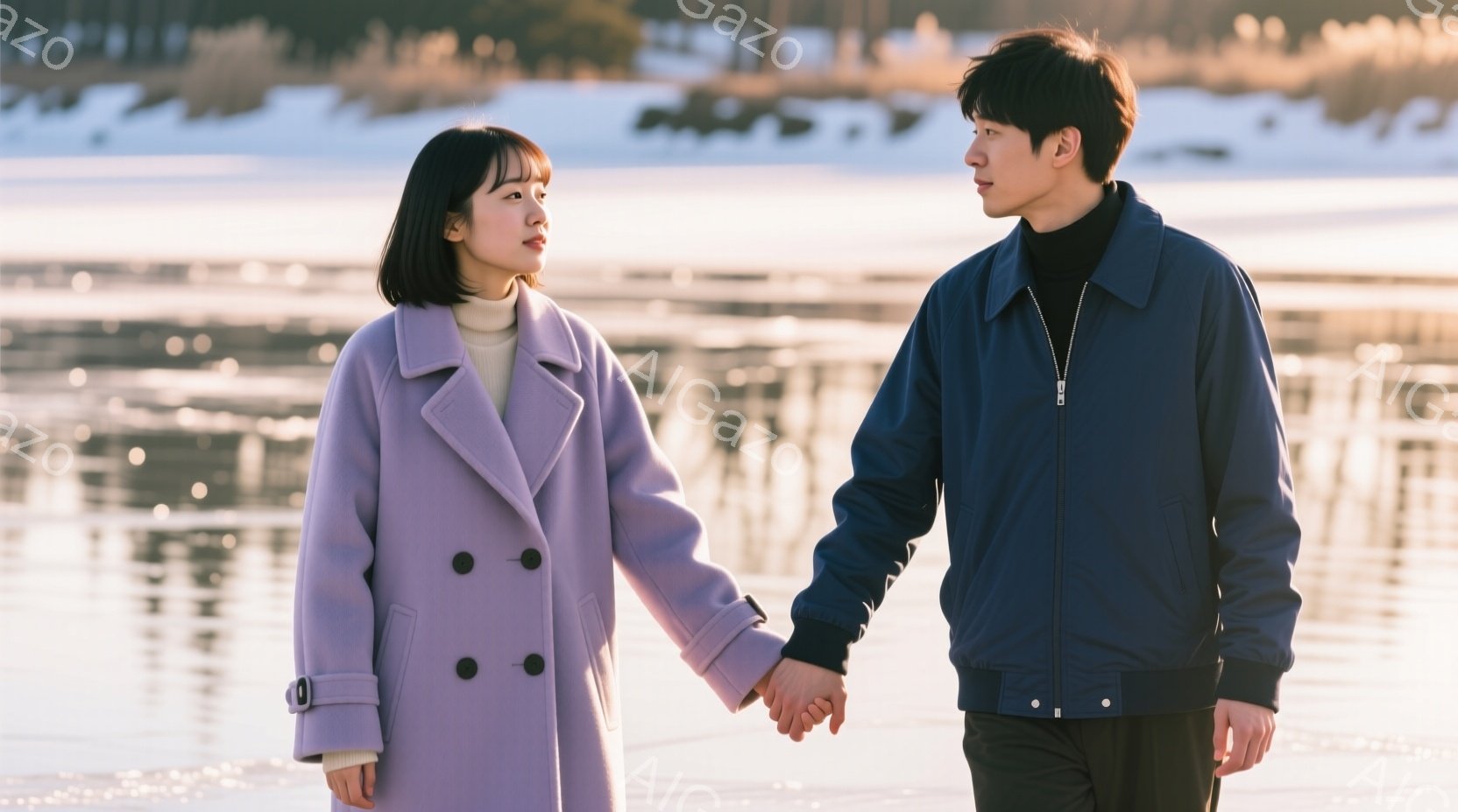 若い女性と男性が手をつないで砂浜を歩いている。女性は明るい紫色のダブルブレストコートに、男性は濃い青色のジャケットを着ており、二人とも笑顔を浮かべている。背景にはぼやけた建物と、夕焼けのような光が反射する海が広がり、暖かく穏やかな雰囲気である。