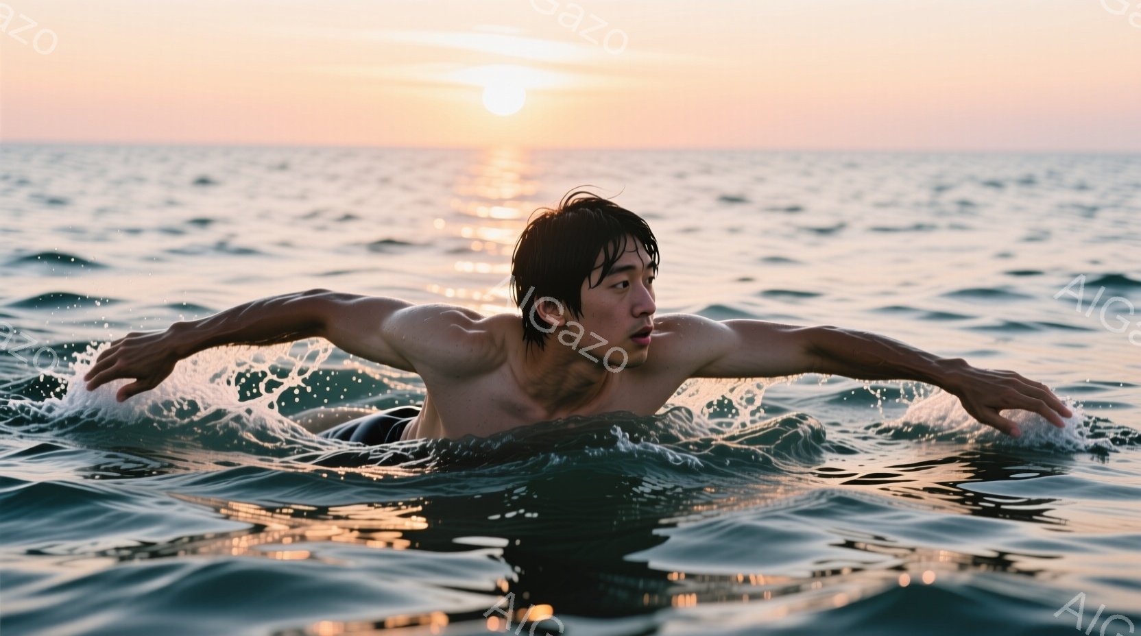 青年が海中で泳いでいる様子が捉えられています。彼は上半身裸で、濡れた髪を後ろに撫でつけ、力強く腕を広げて前進しています。背景には夕焼け空が広がり、水面には光の反射が見られ、穏やかで力強い雰囲気を醸し出しています。