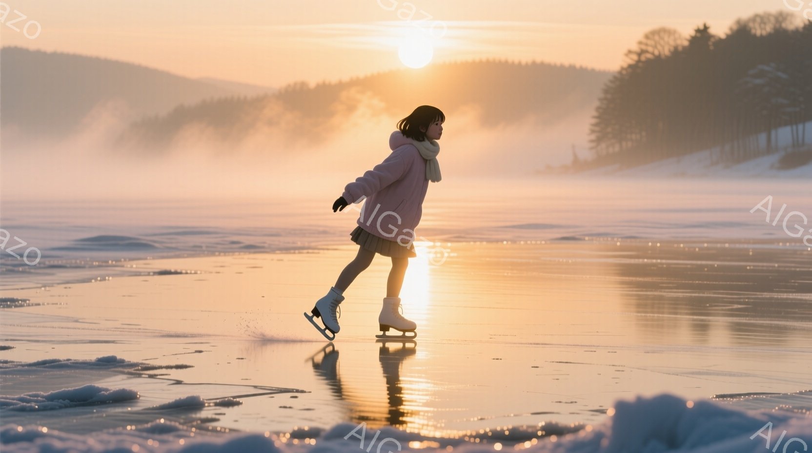 青いコートと白いマフラー、耳当てをつけた若い女性が写っています。彼女は少し微笑んでおり、冬の穏やかな寒さを感じさせる表情をしています。背景には雪景色が広がり、光が水面に反射してキラキラと輝いており、静かで冬らしい雰囲気を醸し出しています。