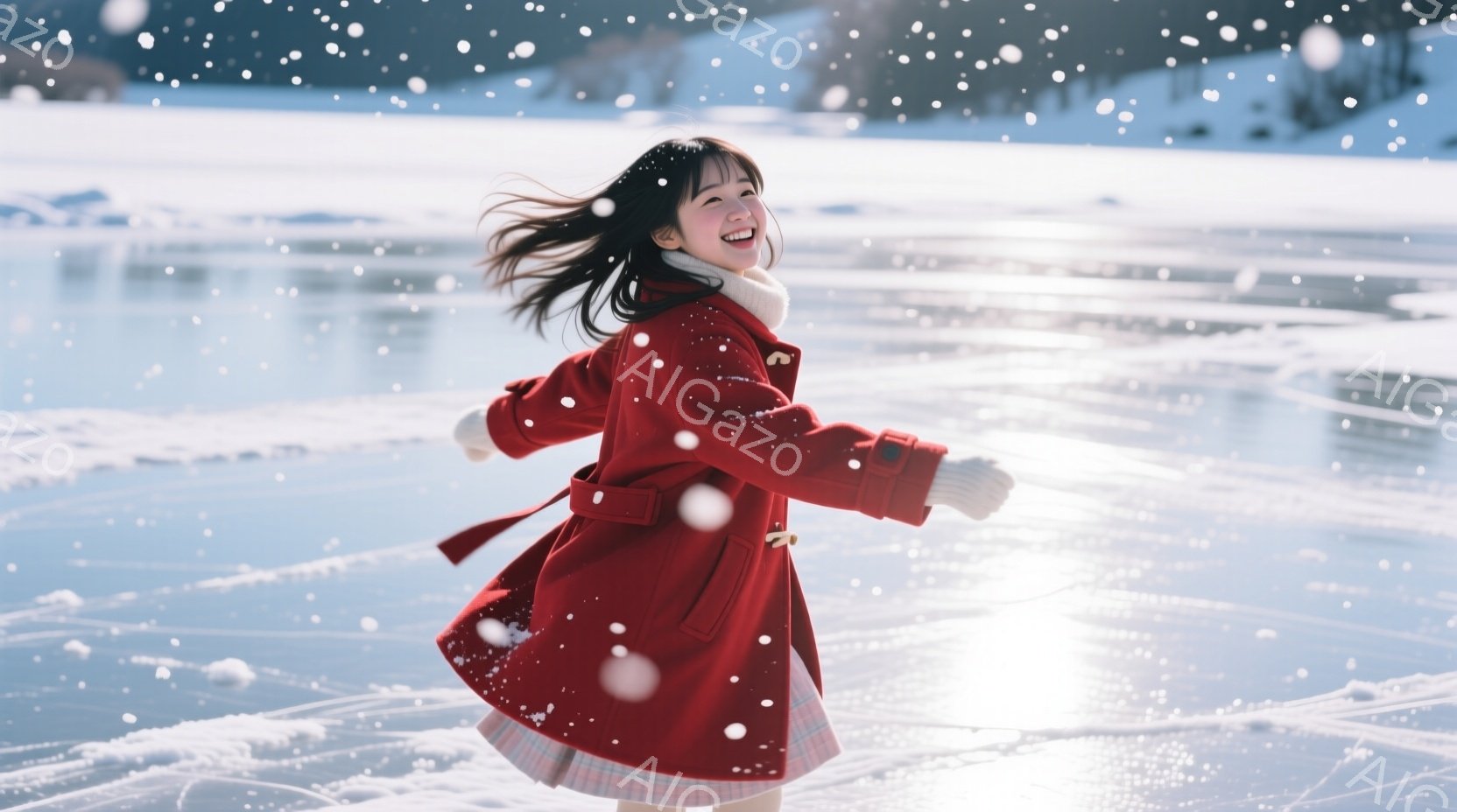 明るい赤色のコートを着た女性が、雪景色の中で両手を広げて立っています。彼女は短い黒髪で、笑顔が印象的です。背景には雪に覆われた景色が広がり、冬の冷たい空気と温かい彼女の笑顔が対照的で、幸せな雰囲気が漂っています。