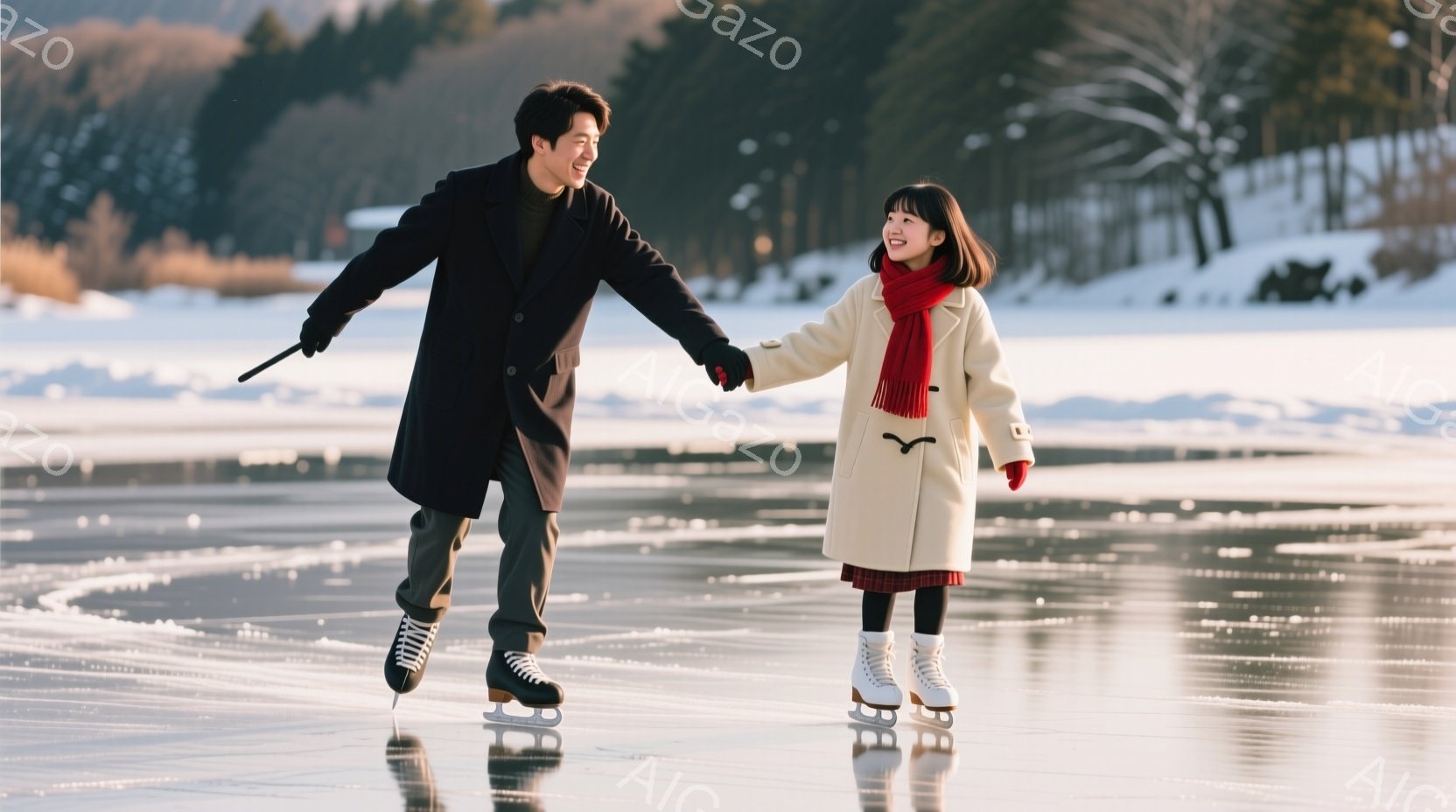 白いスケート靴を履いた若い男女が氷上で手をつないでスケートを楽しんでいる。女性は白いコートに赤いマフラーを巻け、男性は黒いコートを着ており、両者とも笑顔で楽しそうに滑っている。背景には雪景色が広がり、遠くには建物と木々が見える穏やかで冬らしい雰囲気の写真だ。