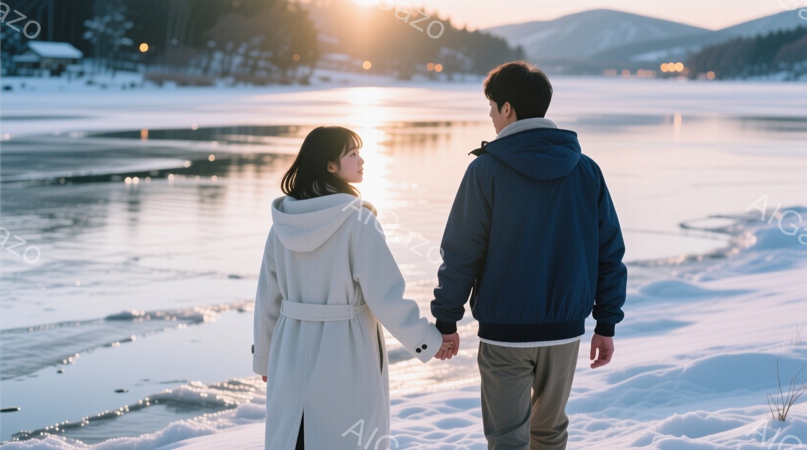 凍てつく湖畔で、一対の男女が手をつないで立っている。女性は白いロングコートにダークヘア、男性は紺色のジャケットにベージュのパンツ姿で、共に正面を向いているが、顔は見えない。背景には雪をまとった山々と、夕焼けのようなオレンジ色の空が広がり、静かで穏やかな冬の雰囲気を醸し出している。