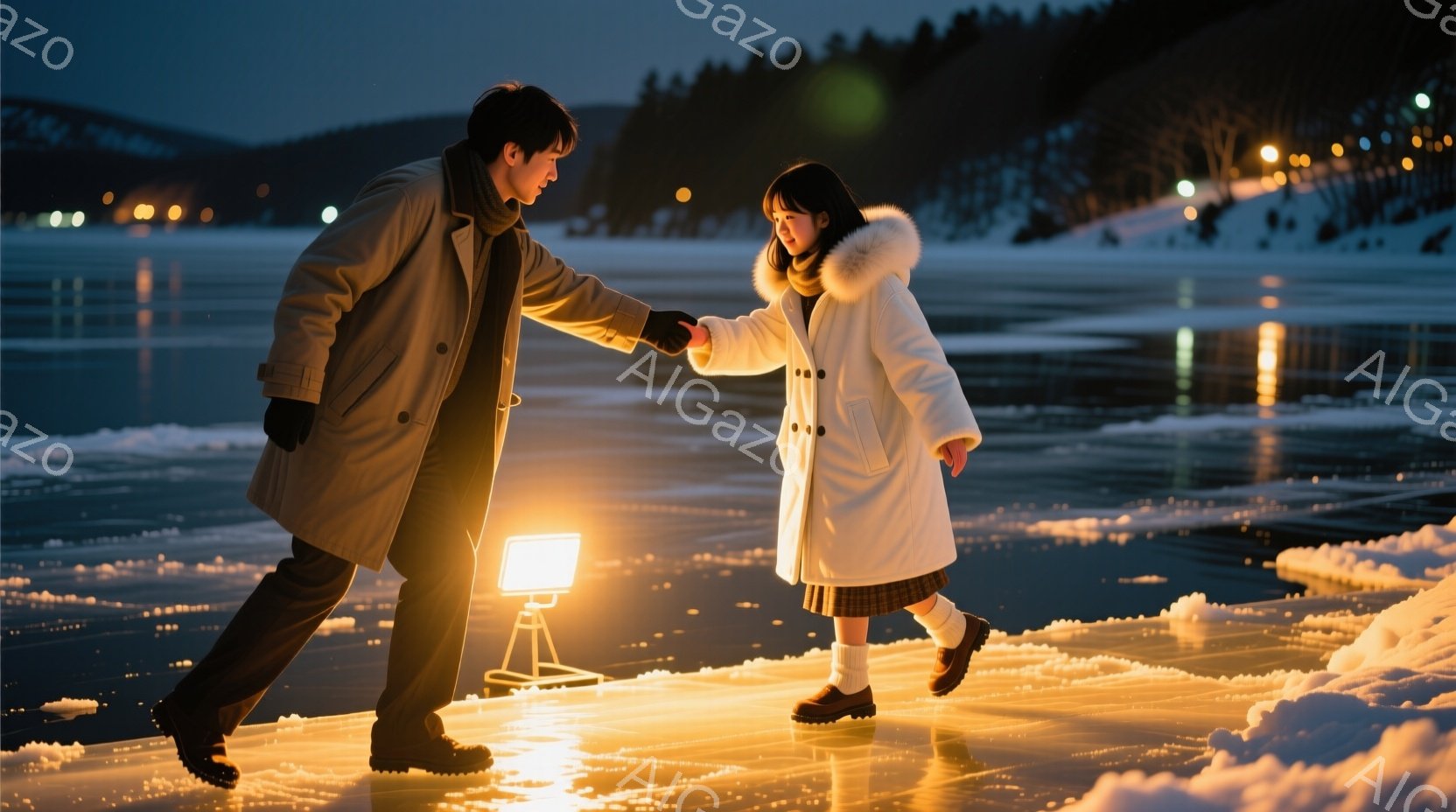 雪に覆われた湖の上に、一対の男女が氷の板の上を歩いている。男性は黒いコートに黒い靴を履き、女性は白い冬のコートと茶色のブーツを着用し、髪を後ろで結んでいる。背景には雪に覆われた山々と、ぼんやりとした街の明かりが見え、全体的に温かくロマンチックな雰囲気を醸し出している。