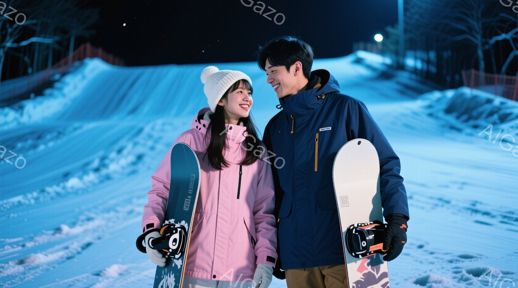 雪景色の中で、若い男女が並んで立っています。女性はピンク色のウィンタージャケットに白いニット帽をかぶり、笑顔を見せています。男性は紺色のジャケットを着ており、女性を見ながら楽しそうに笑っています。
