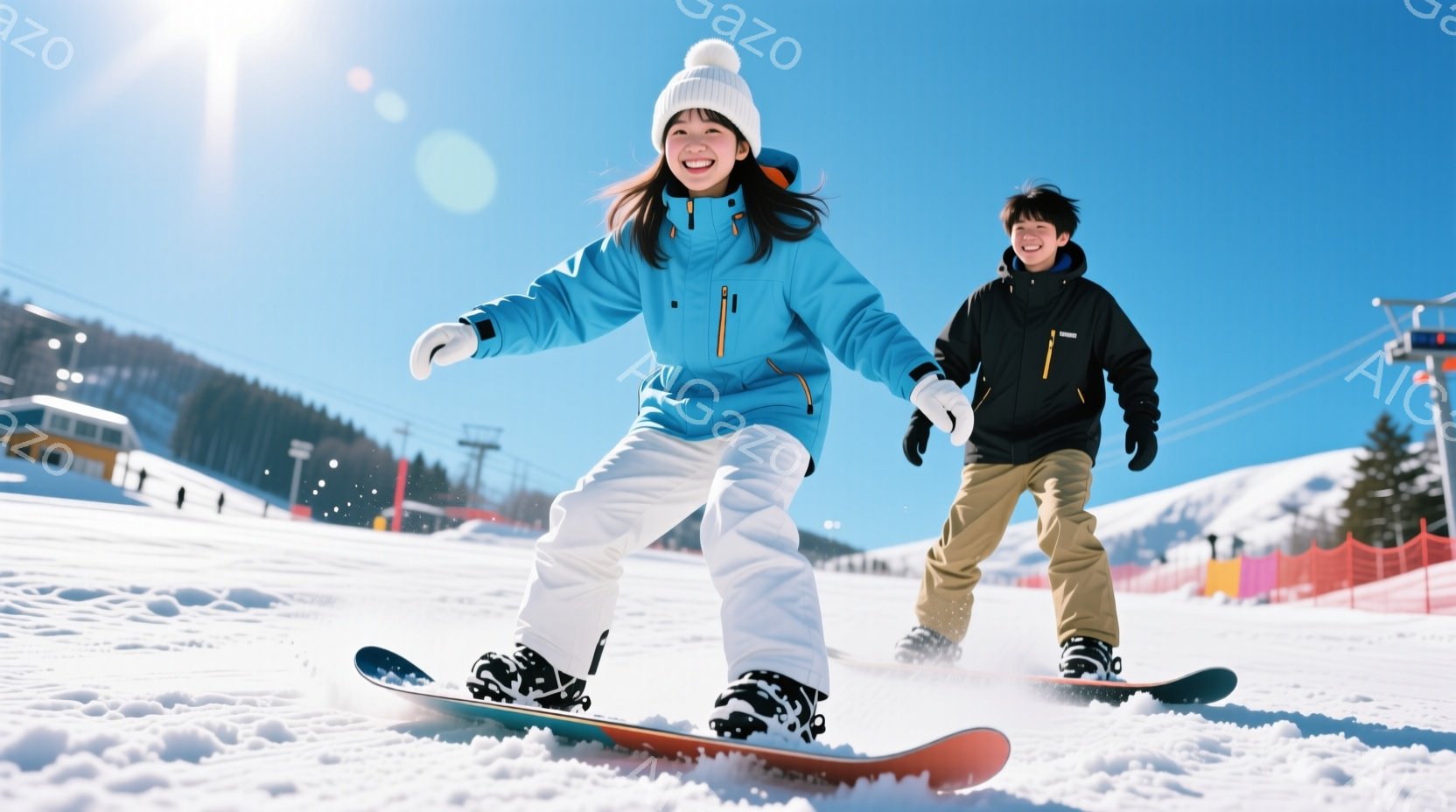 晴れたスキー場で、若い男女がスノーボードを楽しんでいる様子が写っている。女性は水色のスキーウェアに白の帽子をかぶり、笑顔でボードに乗っている。背景には、スキーリフト、雪景色、遠くの山々が見え、爽やかで活気のある雰囲気が漂っている。