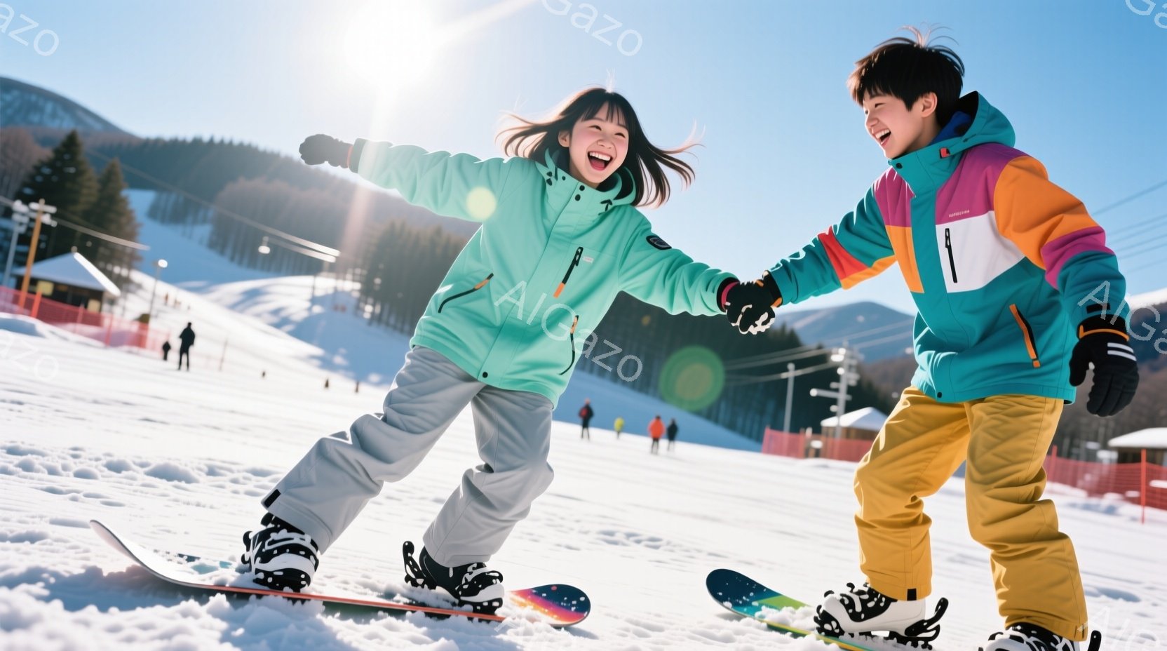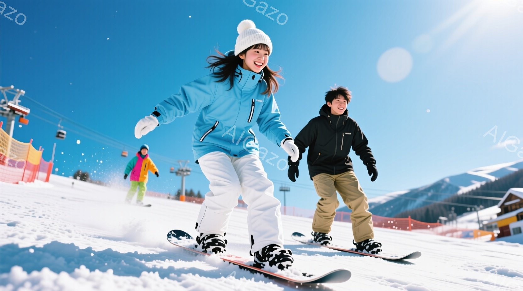 雪山をスノーボードで滑っている若い男女が写っています。女性は青いジャケットと白いズボン、帽子を着用し、笑顔で前に体を乗り出しています。男性は黒いジャケットとベージュのズボンで、少し緊張した表情で滑っています。