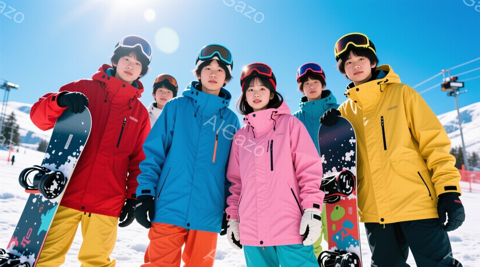 5人の若者が雪山でスノーボードの装備を身につけて笑顔でポーズをとっています。それぞれ鮮やかな色のウィンタージャケット、ゴーグル、帽子を着用し、スノーボードを抱えています。背景には雪景色が広がり、晴天の下でスキー場らしき風景が見え、全体的に明るく楽しい雰囲気が漂っています。