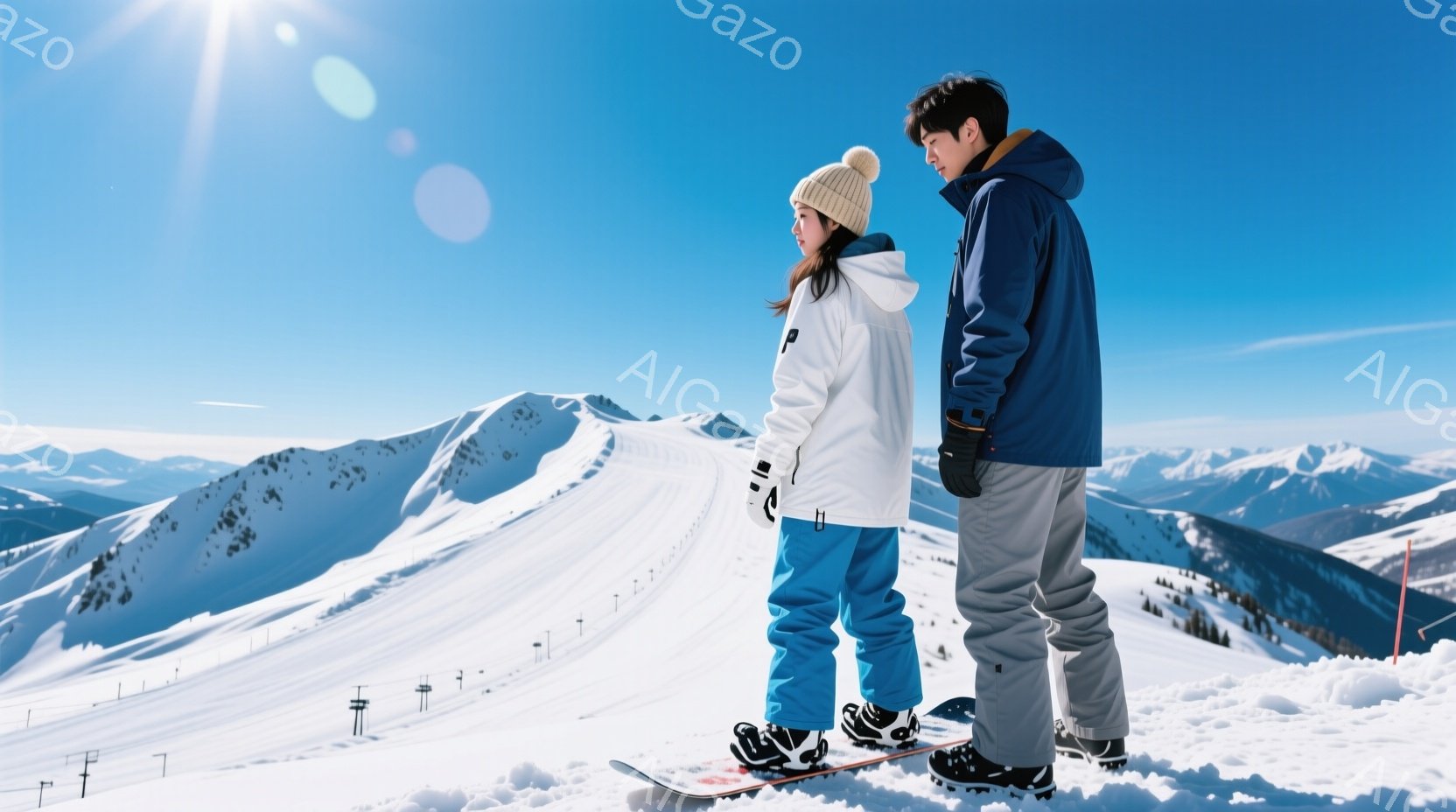 雪山を背景に、若い男女がスノーボードの板の上に立っている。女性は白の防寒着に水色のズボン、ニット帽を被り、男性は紺色のジャケットとグレーのズボンを着用している。背景には雪をまとった山々が広がり、晴天の下、爽やかな冬の雰囲気が漂っている。
