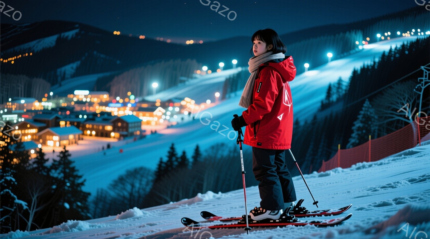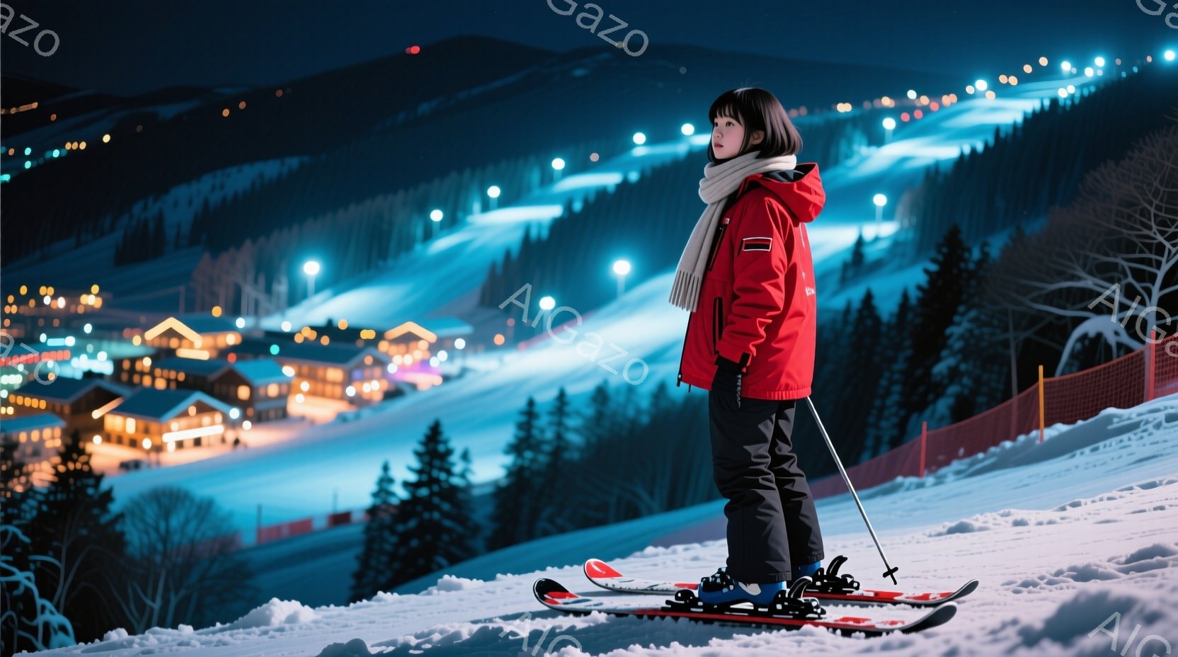雪原に立つ少女は、赤色のスキーウェアと黒のズボンを着用し、頭には暗色の髪をまとめている。彼女はスキー板を装着し、遠くを見つめ、少し物憂げな表情を浮かべている。背景にはライトアップされた建物が並び、雪に覆われた山々と夜空が広がり、静かで幻想的な雰囲気を醸し出している。