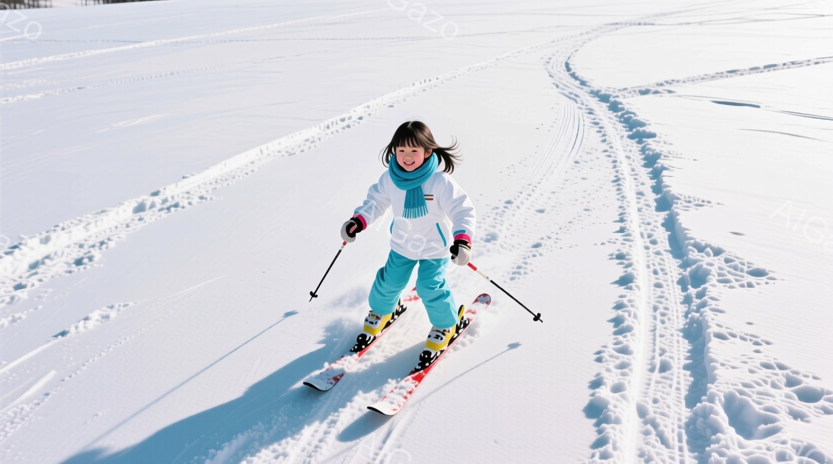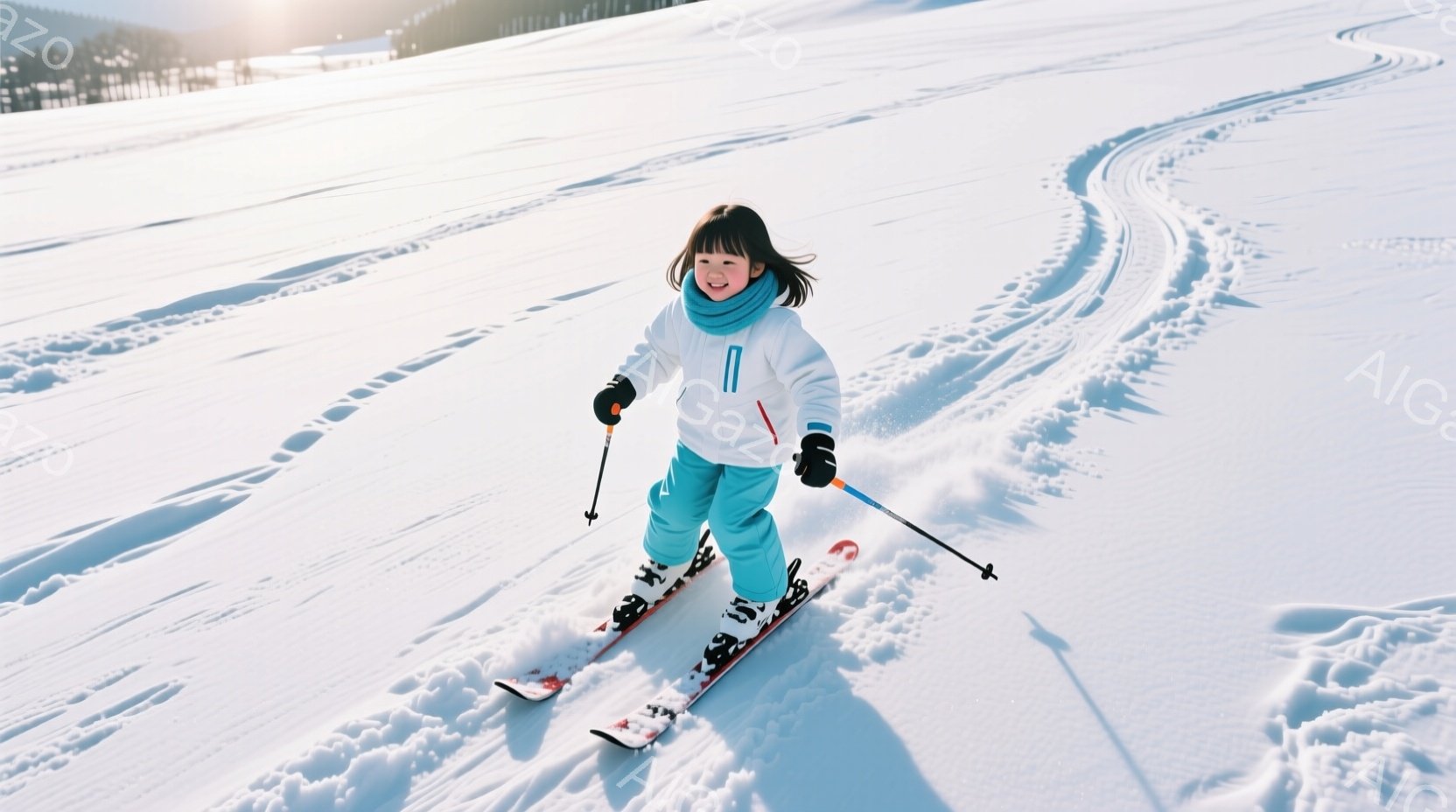 雪の上をスキーをする少女が写っています。彼女は白いジャケットと水色のスキーパンツ、そして白い帽子を着用しており、ピンク色の頬と明るい笑顔を見せています。背景には雪に覆われた斜面が広がり、晴天の下、爽やかな冬の雰囲気が漂っています。