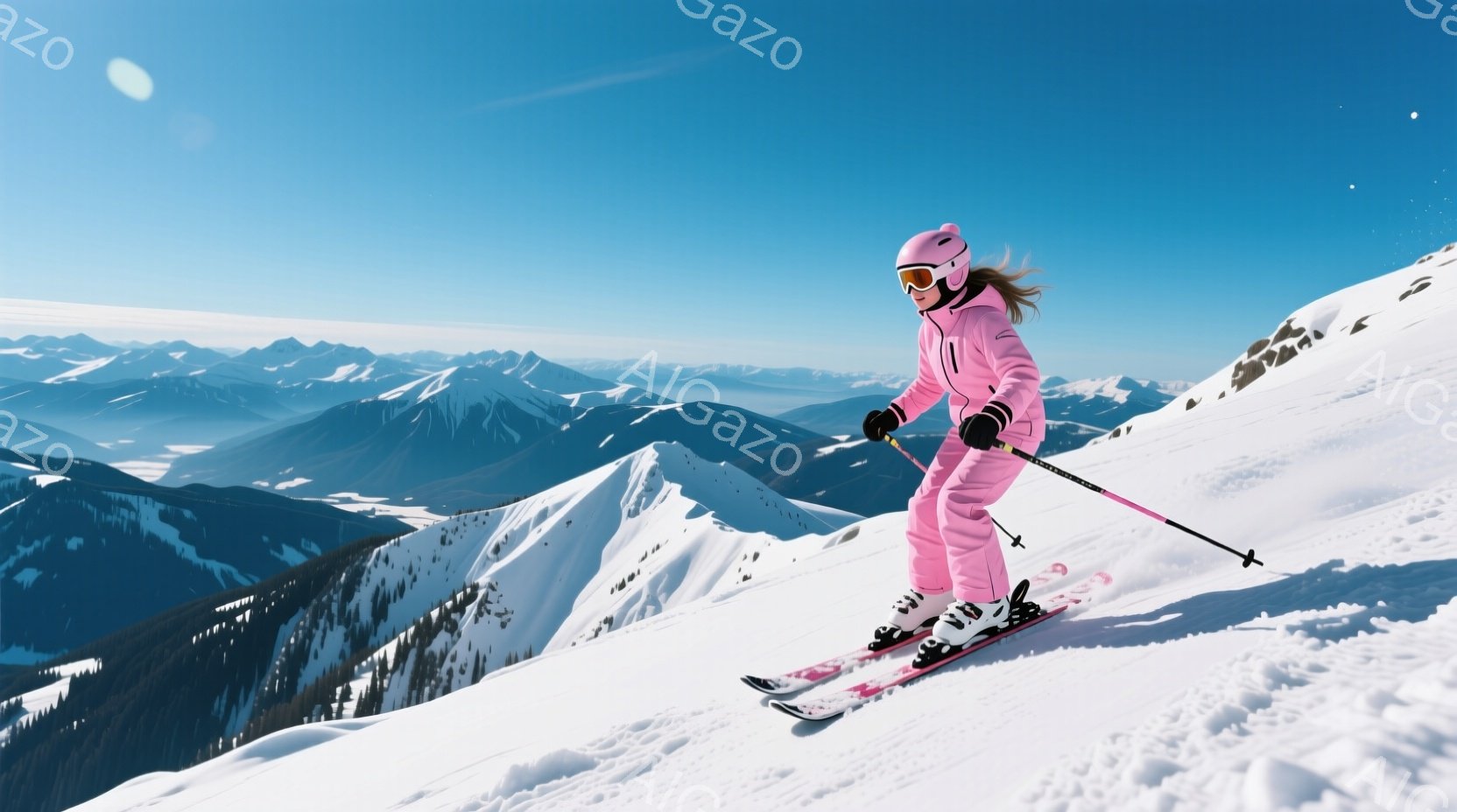 ピンク色のスキーウェアに身を包んだ女性が、雪山を滑走している。彼女は金髪を露出させ、ゴーグル越しに前を見据え、活気に満ちた姿勢でスキーを楽しんでいる。背景には雪をまとった山々が連なり、晴天の下、冬の爽やかな雰囲気が漂っている。