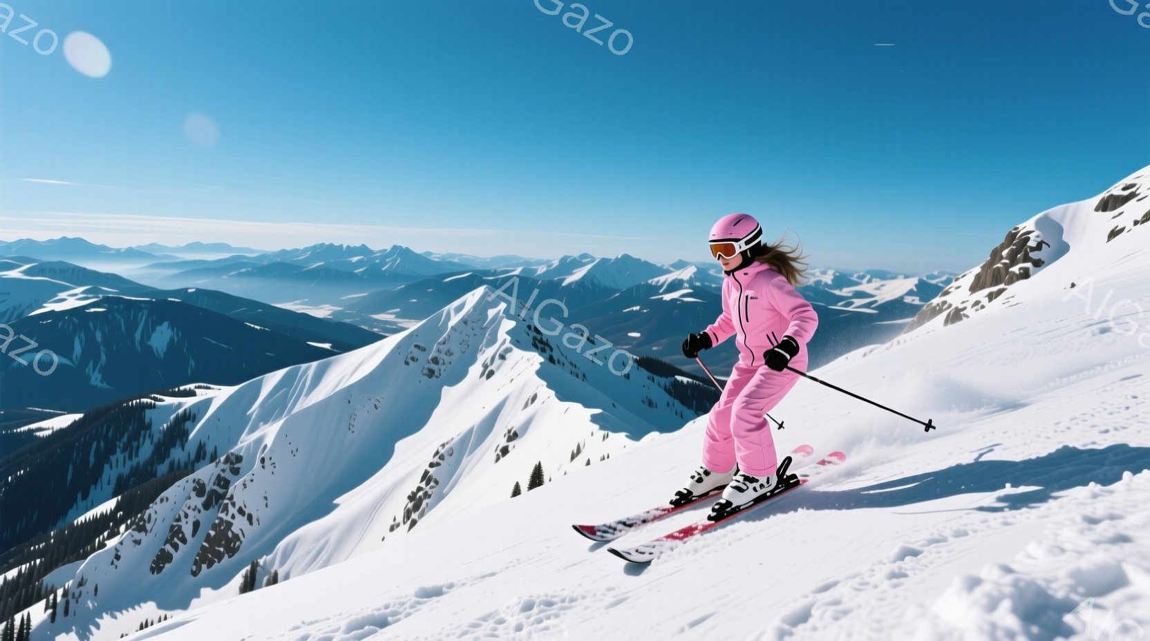 ピンク色のスキーウェアと帽子を身に着けた女性が、雪山を滑降している。彼女は、ピンクと白のスキー板を履き、ポーズを取りながら、雪煙を上げている。背景には、雪を頂いた山々が連なり、晴天の下、爽やかな冬の風景が広がっている。