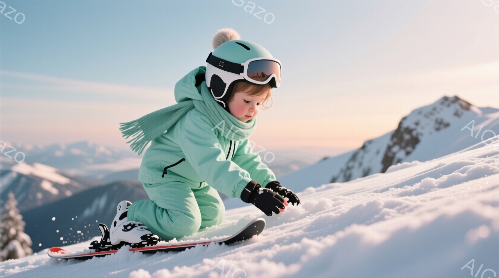 明るい緑色のスキーウェアを着た幼い少女が雪の上にひざまずいて、小さな雪玉を作っています。彼女はニット帽をかぶり、ゴーグルをつけ、雪の中で遊んでいる様子から喜びが伝わってきます。背景には雪を抱いた山々が連なり、空はオレンジとピンクのグラデーションで、穏やかで平和な冬の日の雰囲気が漂っています。