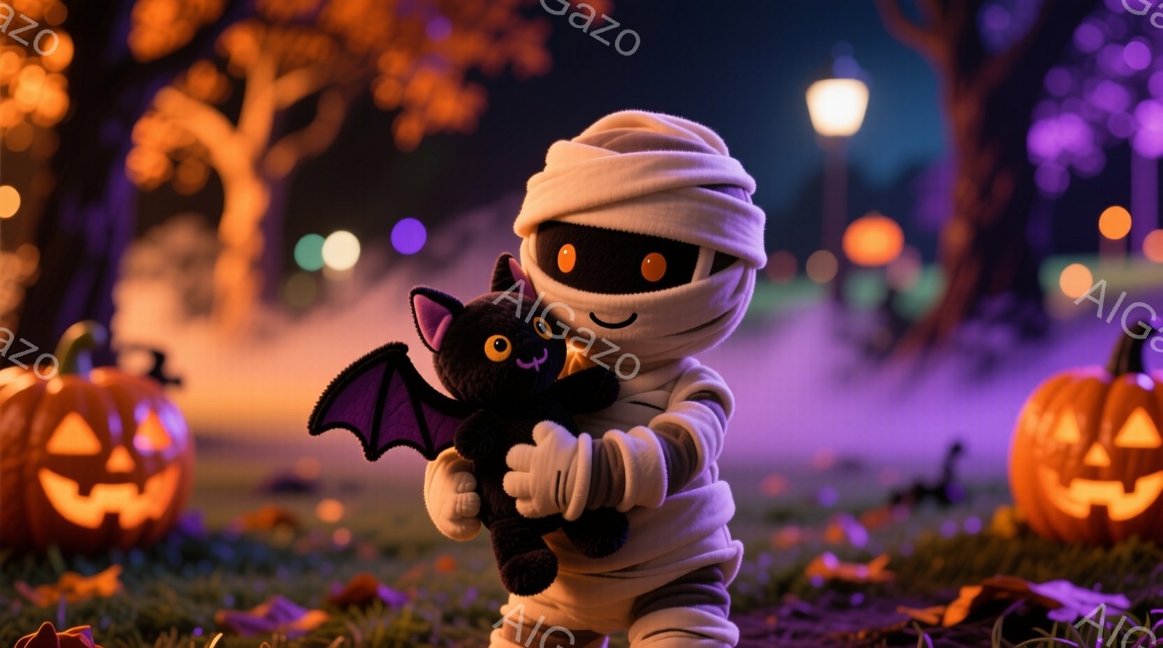 ハロウィーンの衣装を着た幼い子どもが、黒いコウモリのぬいぐるみを抱きしめています。子どもは白い包帯で全身を覆われたミイラの格好をしており、表情ははっきりと見えませんが、楽しそうな雰囲気が伝わってきます。背景には、オレンジ色に光るジャック・オー・ランタンやぼんやりとした木々が見え、ハロウィーンの夜の幻想的な雰囲気を醸し出しています。