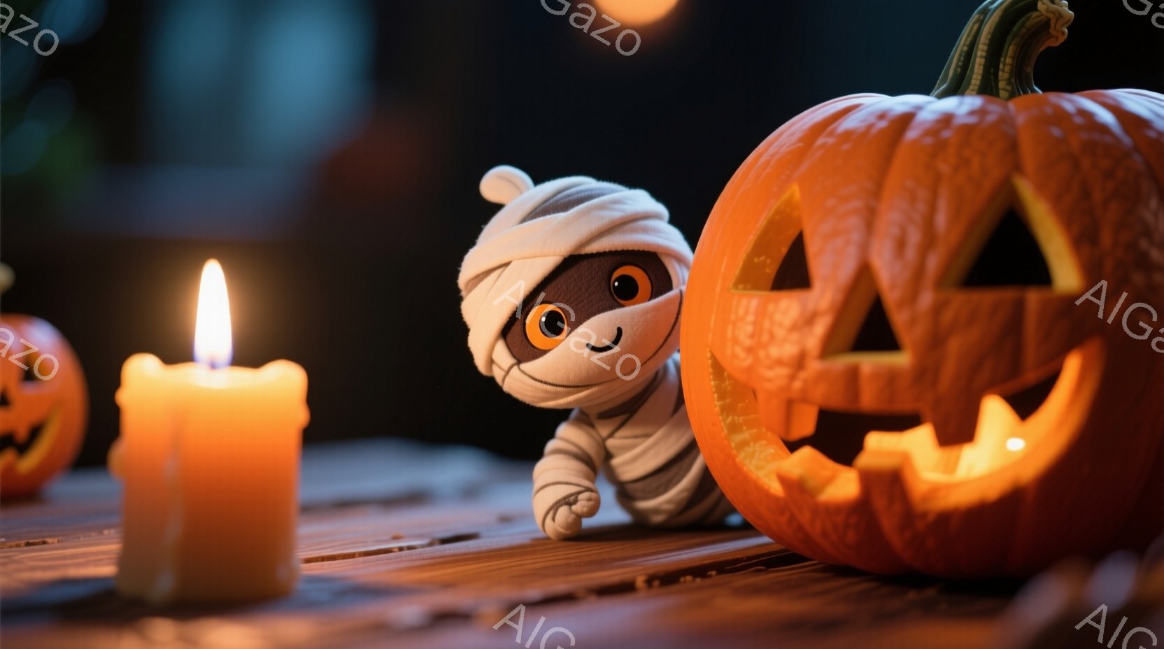 ハロウィーンの飾り付けが施された木製のテーブルの上には、くり抜かれたジャック・オー・ランタンと、包帯で覆われた愛らしいミイラのぬいぐるみが置かれています。ミイラのぬいぐるみは微笑んでおり、テーブルに体を預けて座っています。背景にはぼんやりとした光が差し込み、温かく、お祝いの雰囲気が漂っています。