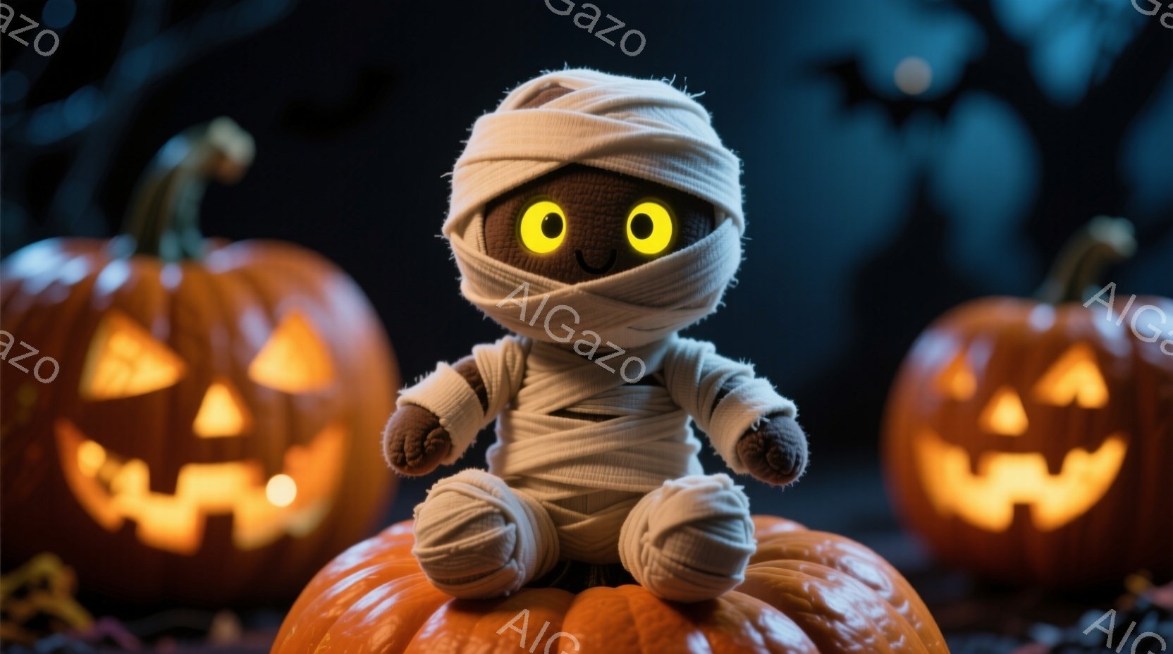 白い包帯で全身を覆われた小さなミイラのような人形が、オレンジ色の大きなカボチャの上に座っています。人形は黒い丸い瞳で、少し微笑んでいるように見え、可愛らしい印象を与えます。背景には、ジャック・オー・ランタンがいくつか浮かび上がり、暗い夜空と枯れた草がハロウィーンの不気味な雰囲気を醸し出しています。