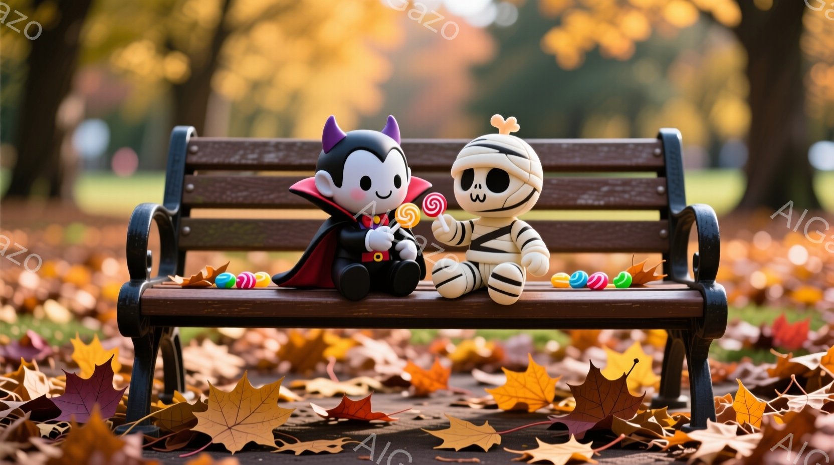 ベンチに座っているのは、ドラキュラとミイラの姿をした可愛らしいキャラクターたちです。ドラキュラは黒い服に赤いケープをまとい、ミイラは包帯でぐるぐる巻きになっています。背景には落ち葉が敷き詰められた公園が広がり、秋の穏やかな雰囲気が漂っています。