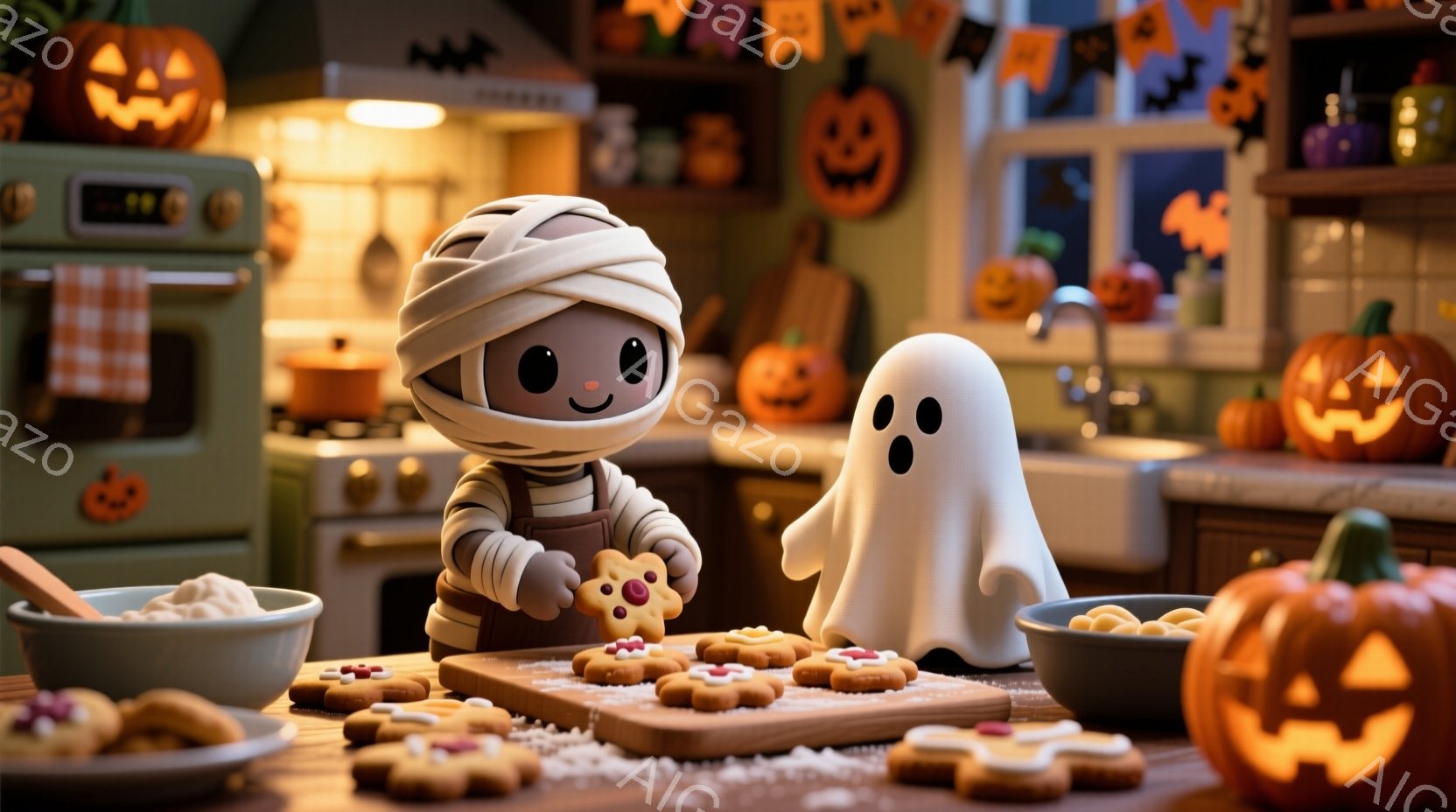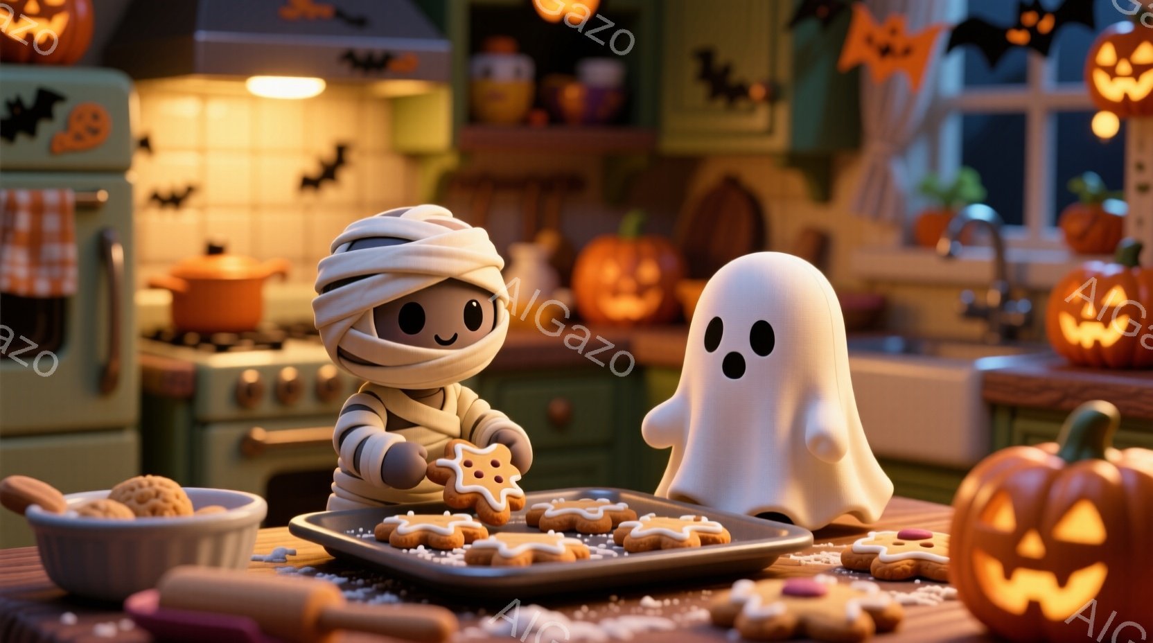 ハロウィンの装飾が施されたキッチンで、ミイラと幽霊のキャラクターがクッキーを作っています。ミイラは白い包帯で覆われ、可愛らしい表情でクッキーを手に持ち、幽霊はふんわりとした白い姿で、ミイラを見つめています。背景には、様々な大きさのジャック・オ・ランタンや、クッキーの入った天板が配置され、温かく、お祝いムードに満ちた雰囲気が漂っています。