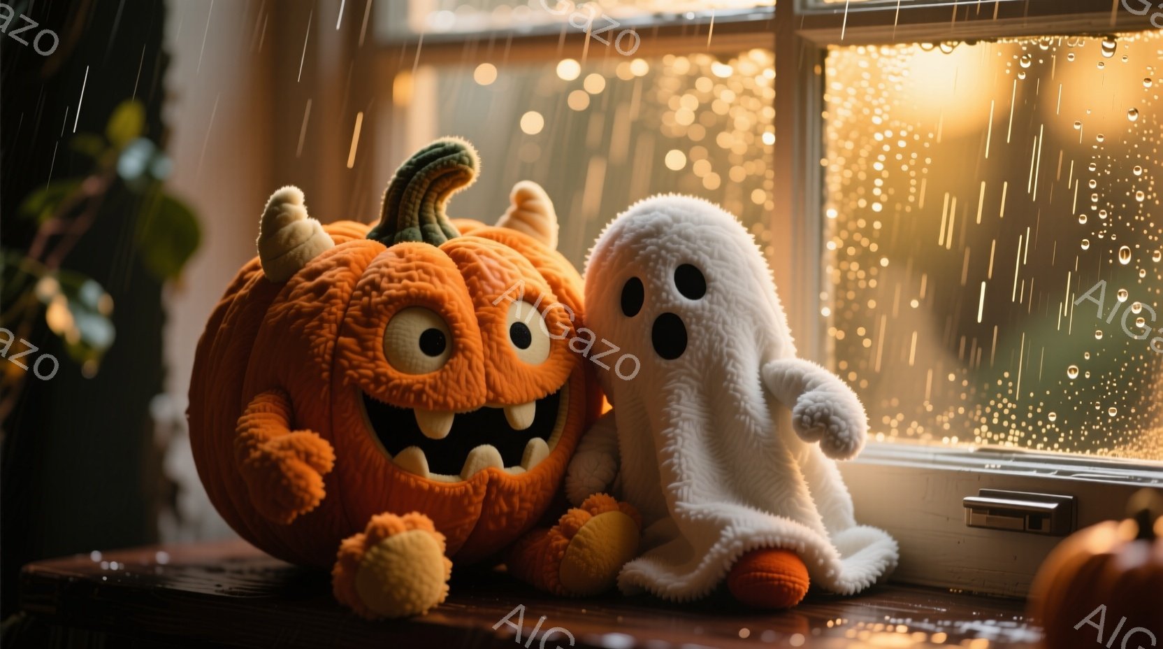 愛らしいハロウィーンのぬいぐるみであるかぼちゃと幽霊が寄り添って座っています。かぼちゃは大きな笑顔で、大きな灰色の足と手を持っています。背景には雨が降る窓があり、暖かくぼんやりとした光が灯っています。