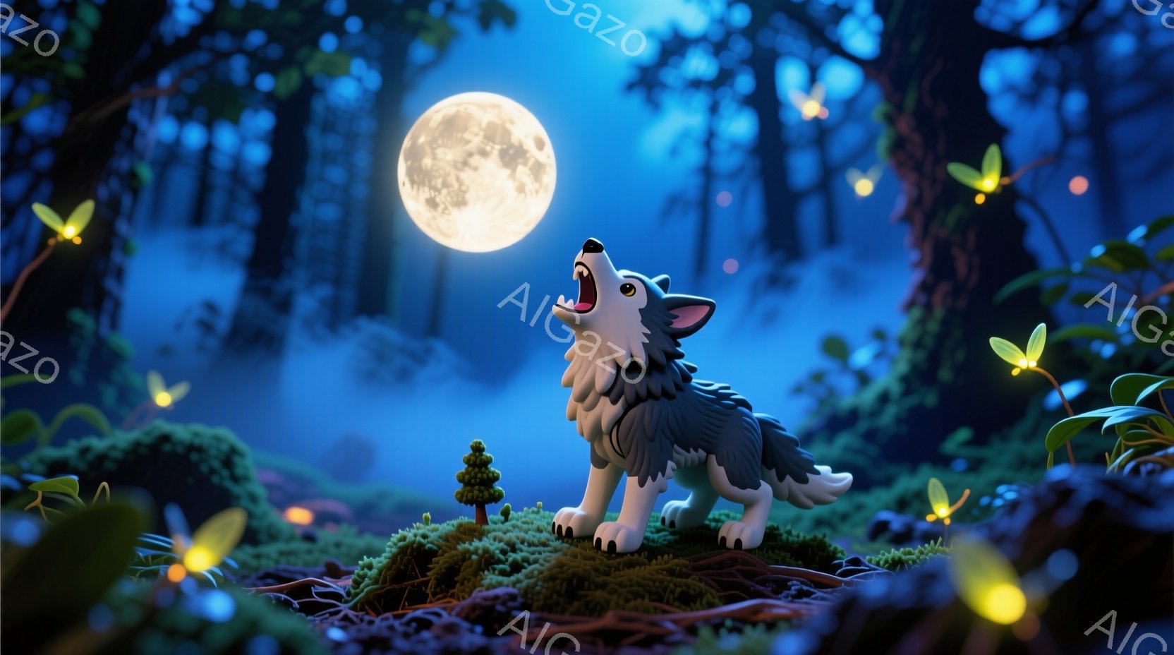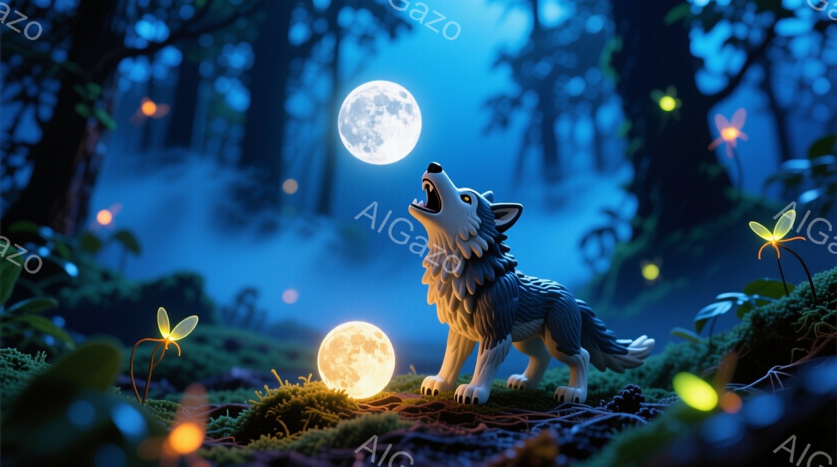 暗い森の中で、狼が月に向かって遠吠えしている様子が描かれている。周囲には、光る植物や小さな光の玉が散らばり、幻想的な雰囲気を醸し出している。背景は深い緑色で、ぼんやりとした木々のシルエットが見え、月明かりが森全体を照らしている。