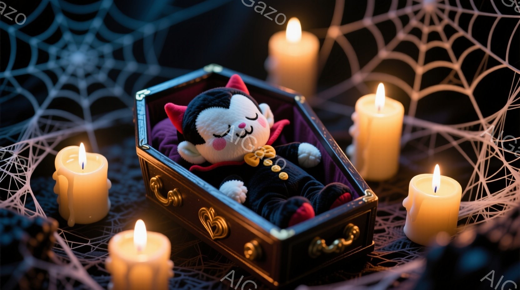 小さな吸血鬼のぬいぐるみが、赤い内張りの小さな棺の中に横たわっています。黒いスーツに赤いベスト、そして蝶ネクタイを身につけ、穏やかな表情で目を閉じ、眠っているようです。背景にはクモの巣が描かれ、周りを数本の燃えるキャンドルが囲んでおり、ハロウィーンらしい不気味で可愛らしい雰囲気を醸し出しています。